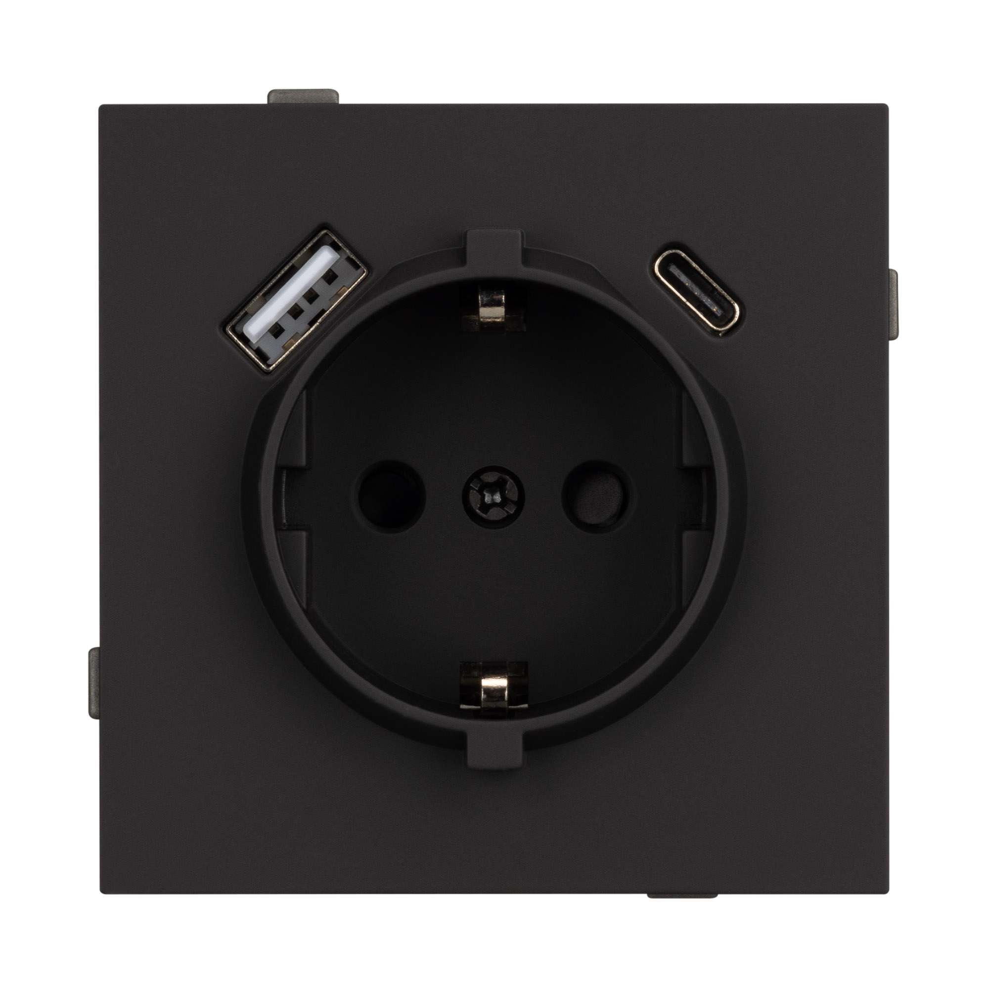 Механизм розетки с USB зарядкой, совместимый с рамками серии TENDO, создает утонченный минималистичный вид. Наличие двух USB Type A + Type C портов позволяет существенно сократить количество используемых розеточных постов под евровилку, сохраняя единую стилистику интерьера всего современного дизайн-проекта. Видимая часть механизма выполнена из высококачественного пластика матового черного цвета и имеет Soft-Touch покрытие, что придает изделию приятные тактильные ощущения и стильный внешний вид. Розетка оснащена заземляющими контактами и защитными шторками, обеспечивая надежное и безопасное подключение электроприборов. Контактная часть присоединяется при помощи винтовых зажимов, позволяя надежно подсоединить механизм выключателя к питающим элементам. А усиленные распорные лапки двойного захвата надежно фиксируют механизм в установочном подрозетнике круглого сечения диаметром от 60мм. На каждой стороне суппорта размещены фиксирующие элементы, позволяющие комбинировать механизмы в системы до 5шт горизонтально, под соответствующую рамку.