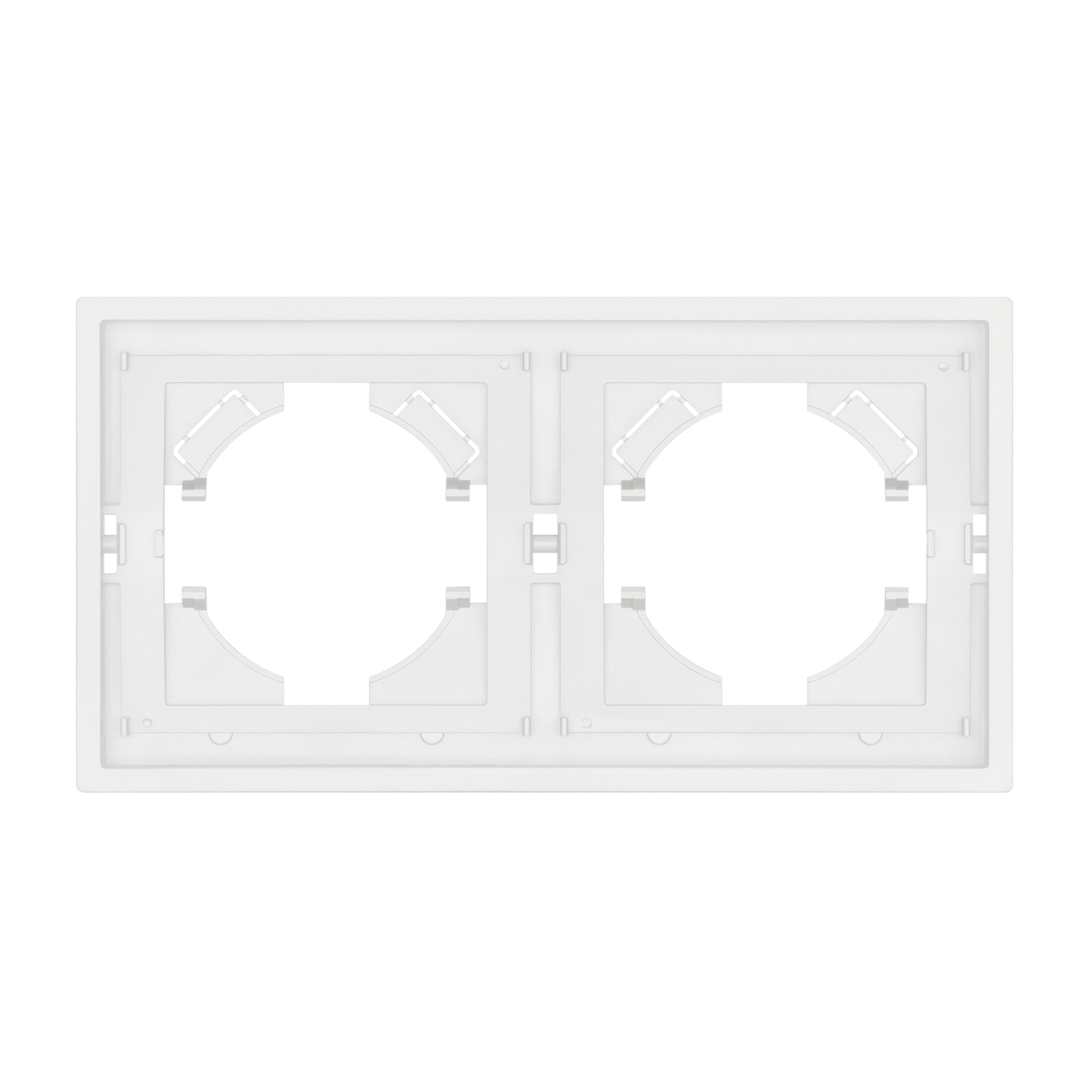 Рамка пластиковая на 2 поста, под встраиваемый механизм. Цвет - матовый белый, с Soft-Touch покрытием. Уровень герметичности IP20. Ориентация монтажа горизонтальная. Габаритные размеры: длина 150 мм, ширина 80 мм, высота 9 мм. Гарантийный срок 12 мес.
