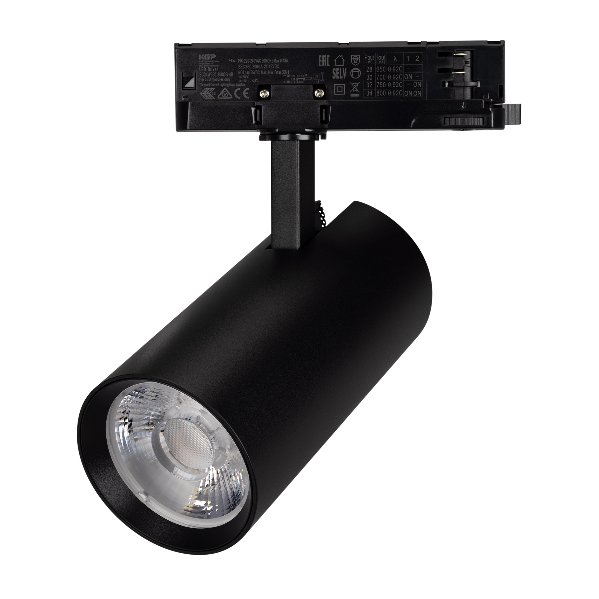 Светильник для треков/шин 4 провода. Мощность 30 Вт, св. поток без решетки honeycomb 3000 лм, 100 лм/Вт, с решеткой honeycomb 1980 лм, 66 лм/Вт, дневной 4000 K, CRI>90, угол 36°, напряжение питания 230 В. Черный круглый корпус из алюминия, материал линзы PMMA, степень защиты IP20. Антибликовая решетка honeycomb в комплекте. Размер: диаметр 90 мм, длина световой части 141 мм. Монтаж на трек 3-фазный. Драйвер встроенный 24-42 В, 750мА., пульсация <5%