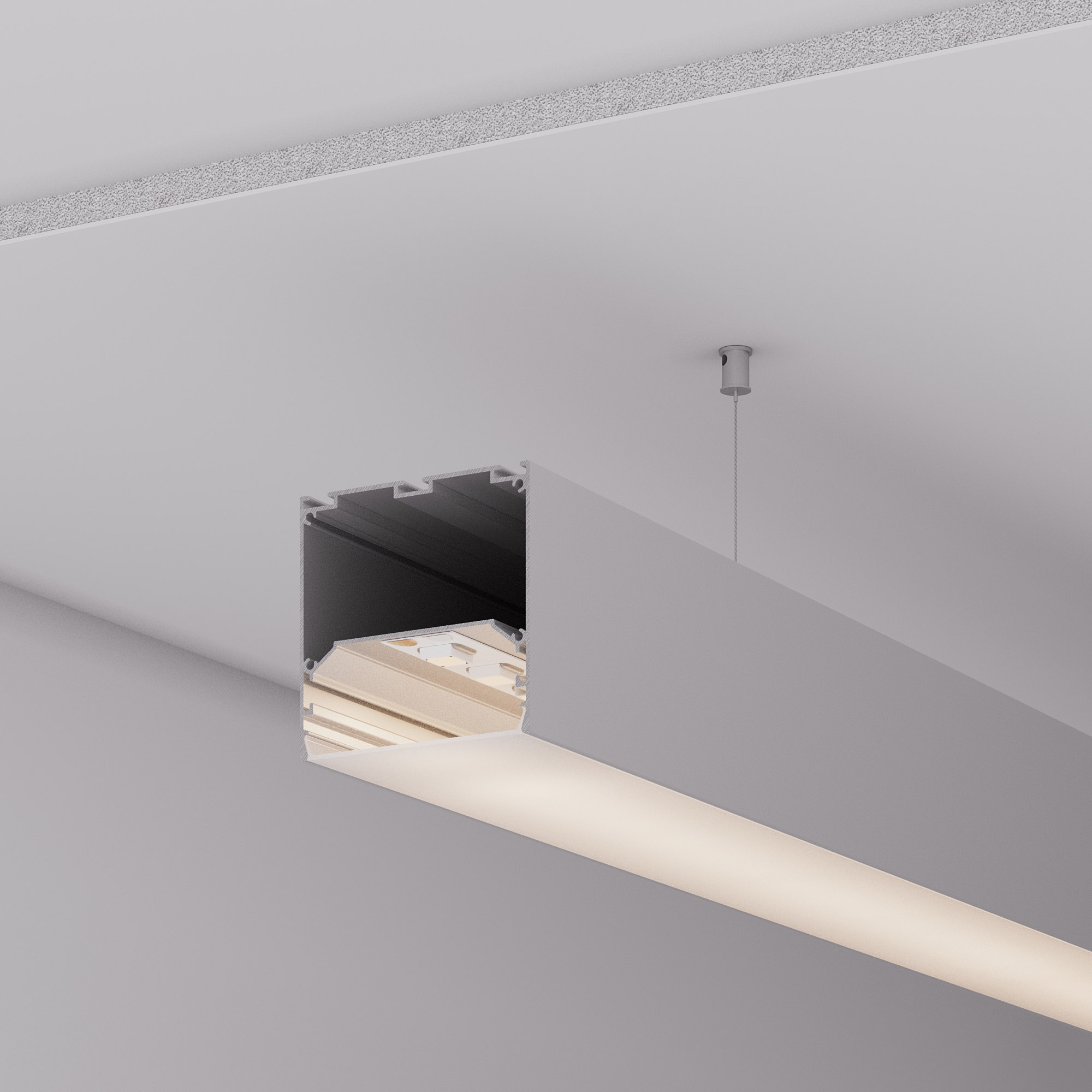 Подвесной/накладной профиль из анодированного алюминия с отсеком для блока питания (72,5х33,3 мм) для основного освещения и контурной подсветки. Габаритные размеры профиля составляют 3000 мм в длину, 75 мм в ширину и 75 мм в высоту. Площадка для установки светодиодных лент позволяет использовать ленту шириной до 50 мм и мощностью до 78 Вт/м. Это обеспечивает гибкость в выборе светодиодных лент и создает потрясающие световые решения. Экраны, заглушки и другие аксессуары не включены в комплект и приобретаются отдельно. Цена указана за 1 метр профиля. Отличное решение для создания современных световых проектов. При изготовлении светильников длиной, превышающей длину профиля, соединители необходимо крепить к стенками профиля винтами с минимальным усилием, до первого ощущения сопротивления.