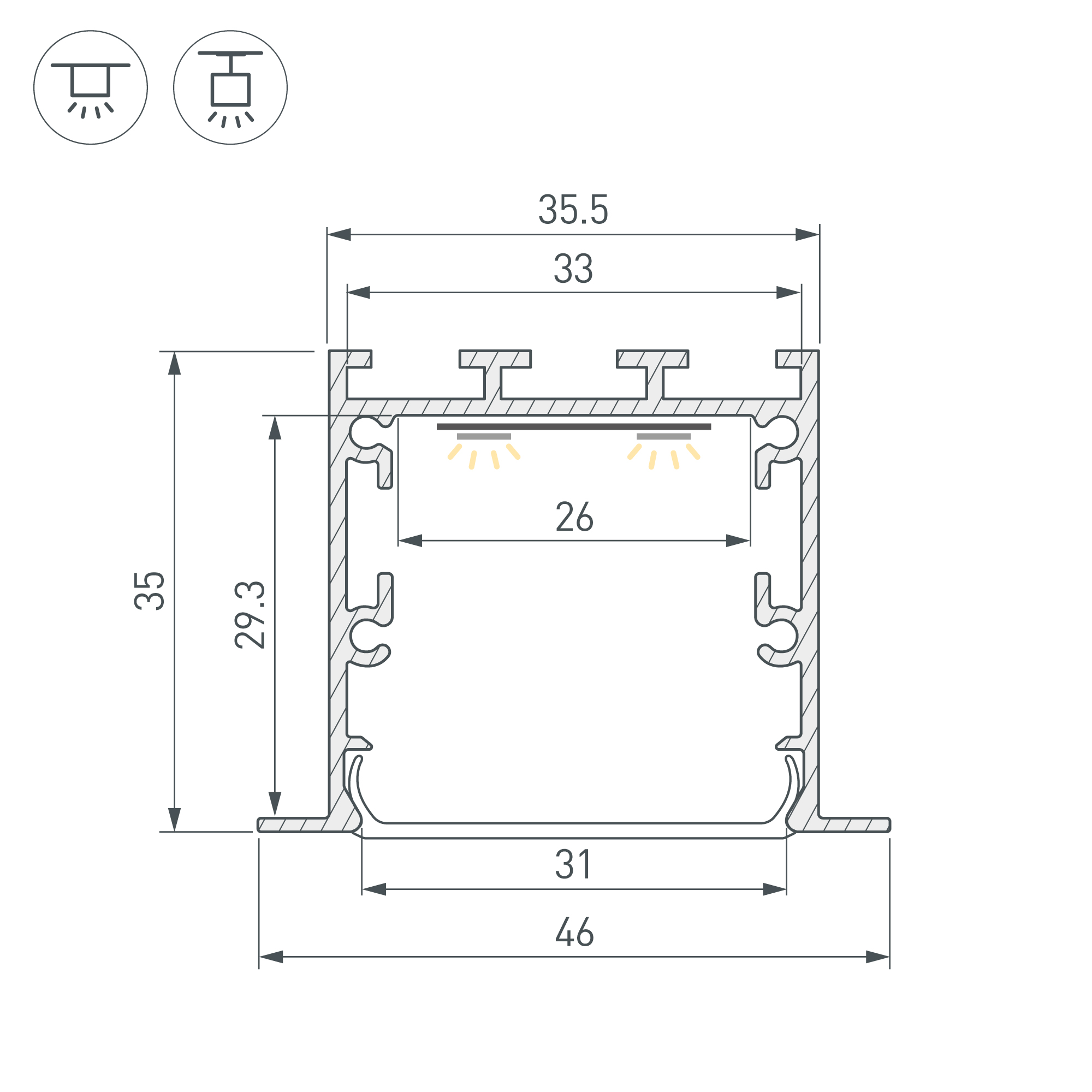Алюминиевый профиль для светодиодных лент и линеек. Цвет - белый RAL9003 (порошковая окраска). Габаритные размеры (L×W×H): 2000x46x35 мм. Ширина площадки для ленты 26 мм. Экраны, заглушки и другие аксессуары приобретаются отдельно. Цена за 1 метр.