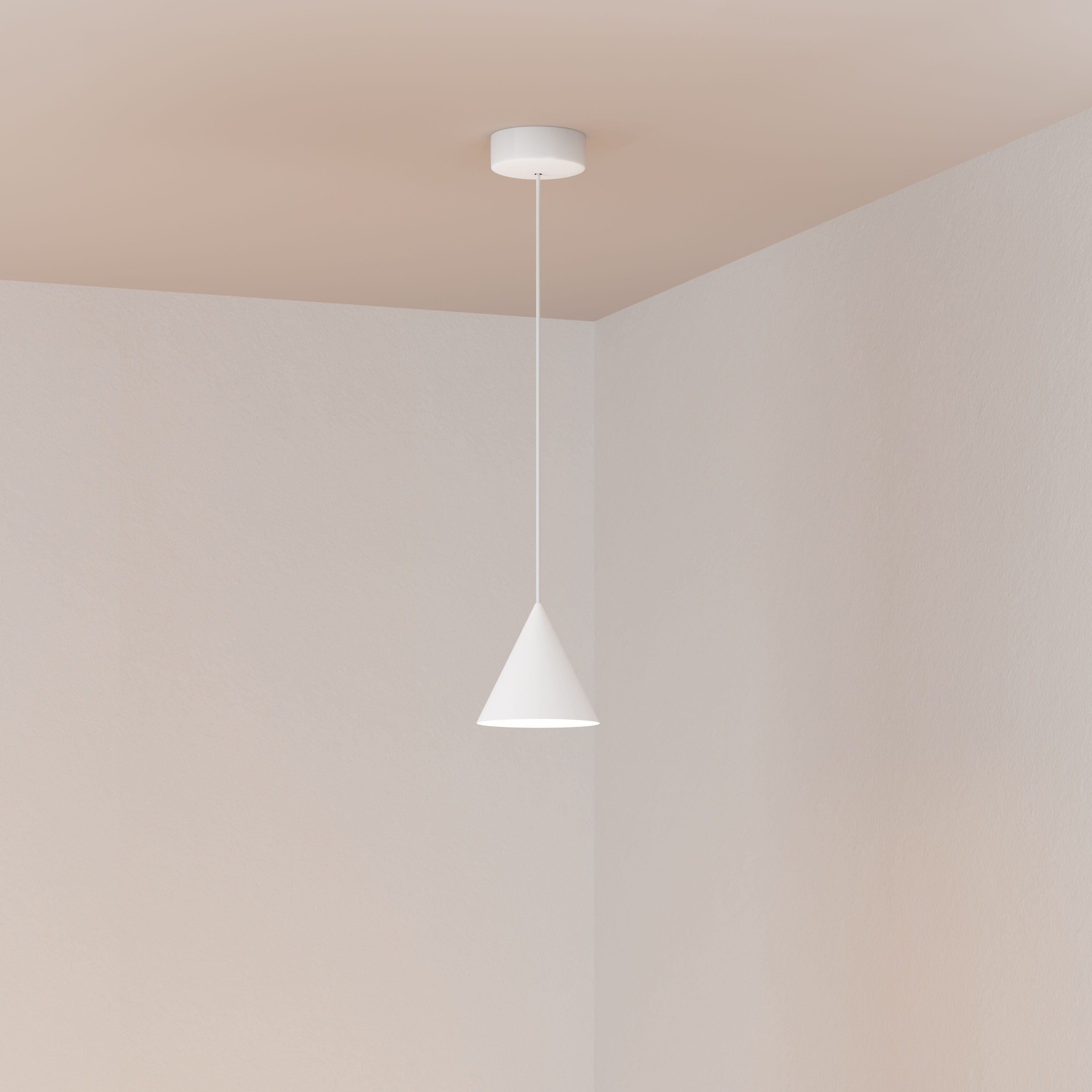 Подвесной светильник. Мощность 10 Вт, св. поток 550 лм, 55 лм/Вт, теплый2700 K, CRI>94, угол 36°, напряжение питания 230 В. Белый корпус из алюминия в форме конуса с белой внутренней поверхностью, линза-рассеиватель из PMMA, степень защиты IP20. Размер: диаметр 180 мм, высота 175 мм. Монтаж подвесной, длина подвеса 2000 мм, регулируемая. В комплекте две чаши. Габариты чаши (встроенной) Ø80 х 41 мм, врезное отверстие Ø55 мм, габариты чаши (накладной) Ø110 х 25 мм. Драйвер 2,8-12В, 500 мА, пульсация <1%. Управление по TRIAC.