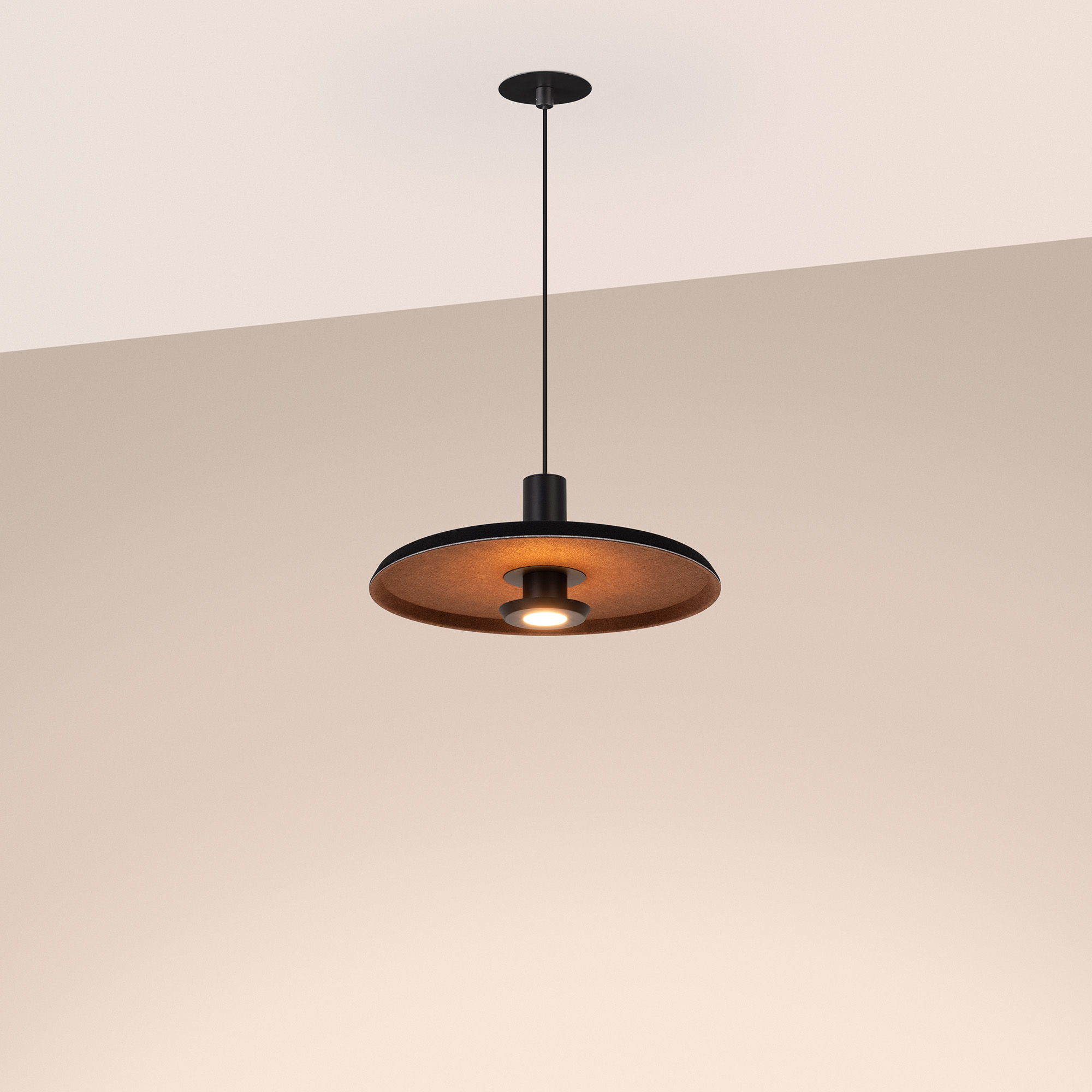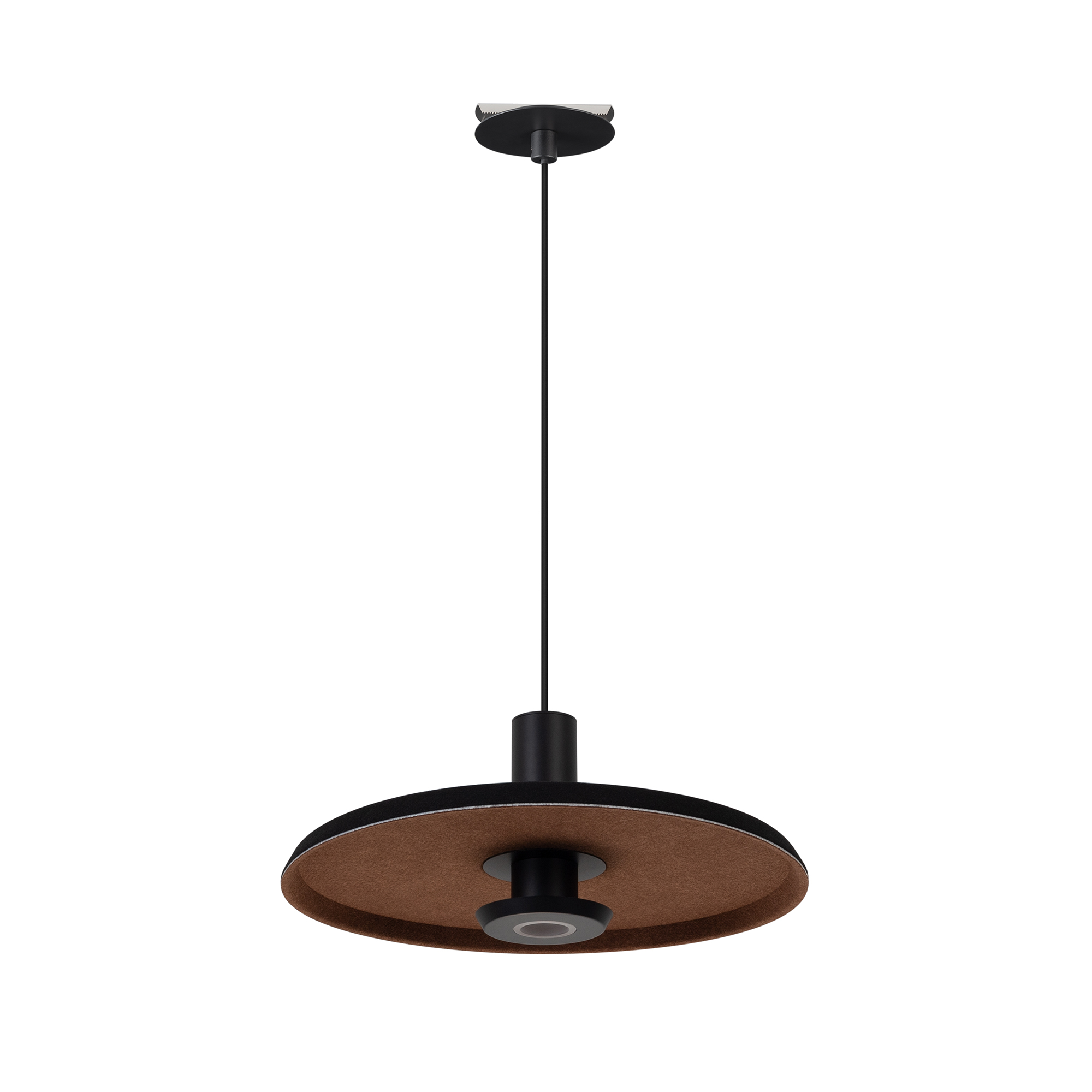 Подвесной светильник. Мощность 12 Вт, св. поток 597 лм, 49 лм/Вт, теплый 2700 K, CRI>94, угол 36°, напряжение питания 230 В. Черный фигурный корпус из переработанного фетра с внутренней поверхностью цвета мокко, линза-рассеиватель из PMMA, степень защиты IP20. Размер: диаметр 350 мм, высота 145 мм. Монтаж подвесной, длина подвеса 2000 мм, регулируемая. В комплекте 2 вида чаш. Габариты чаши (встраиваемая) Ø80 х 23 мм, врезное отверстие Ø60 мм. Габариты чаши (накладная) Ø120 x 35 мм. Драйвер 59 В, 300 мА, пульсация <1%. Управление по TRIAC.