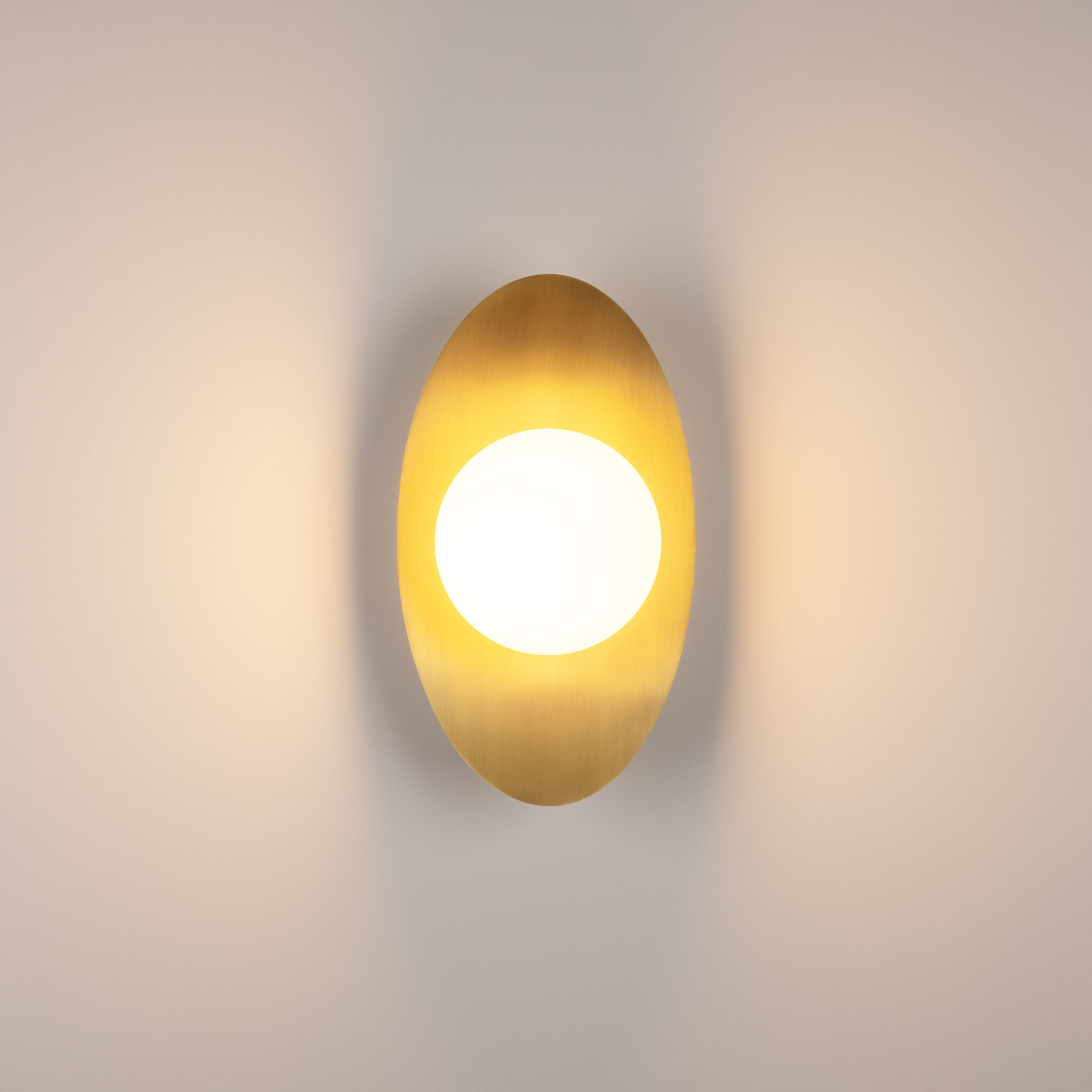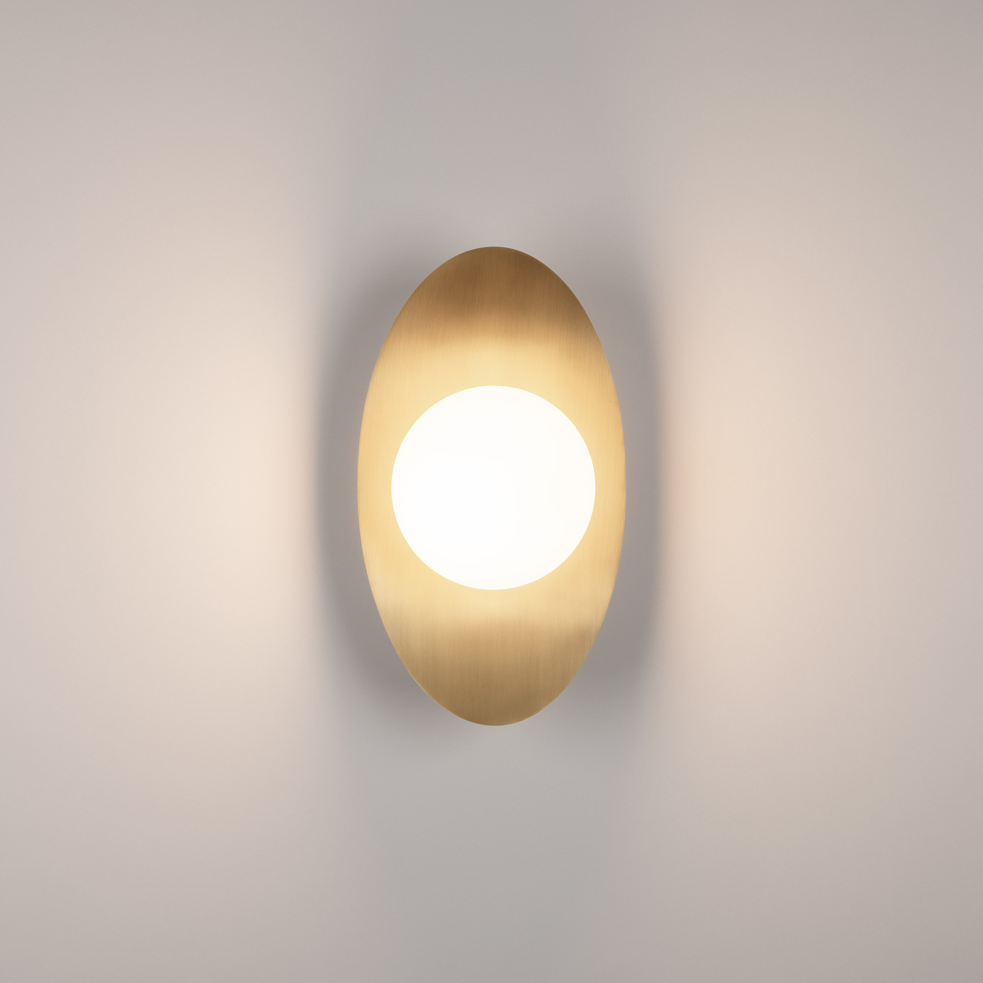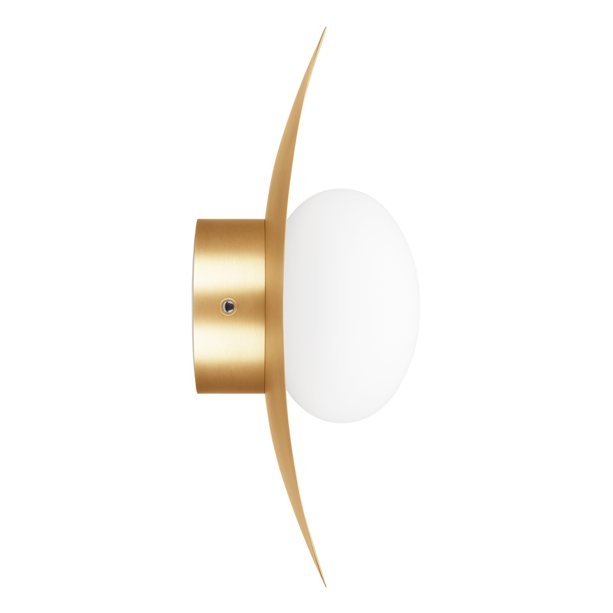 Декоративный настенный светильник. Мощность 6 Вт, св. поток 325-340 лм, 50-52 лм/Вт, теплый 2700 K,теплый 3200К, дневной 4000 K (переключаются), CRI>92, угол 150°, напряжение питания 230 В. Фигурный корпус из алюминия, гальванизированного в цвет светлое золото, экран из матового стекла, степень защиты IP20. Размер: габариты световой части: Ø145x70 мм, габариты чаши: Ø110 x 42 мм. Монтаж накладной. Встроенный блок питания: 12В DC, 0,75А, пульсация <2%. Встроенный диммер TOUCH-DIM.