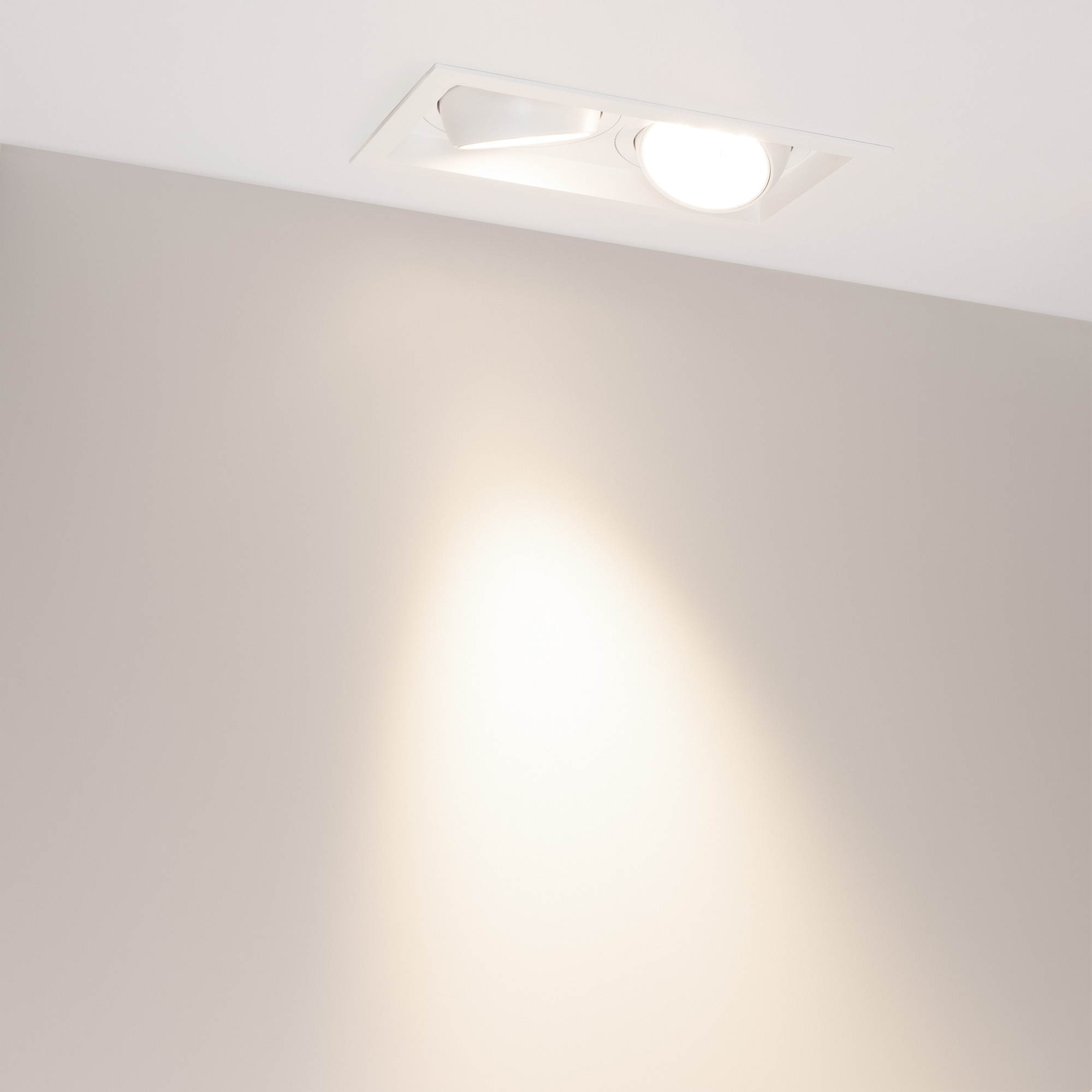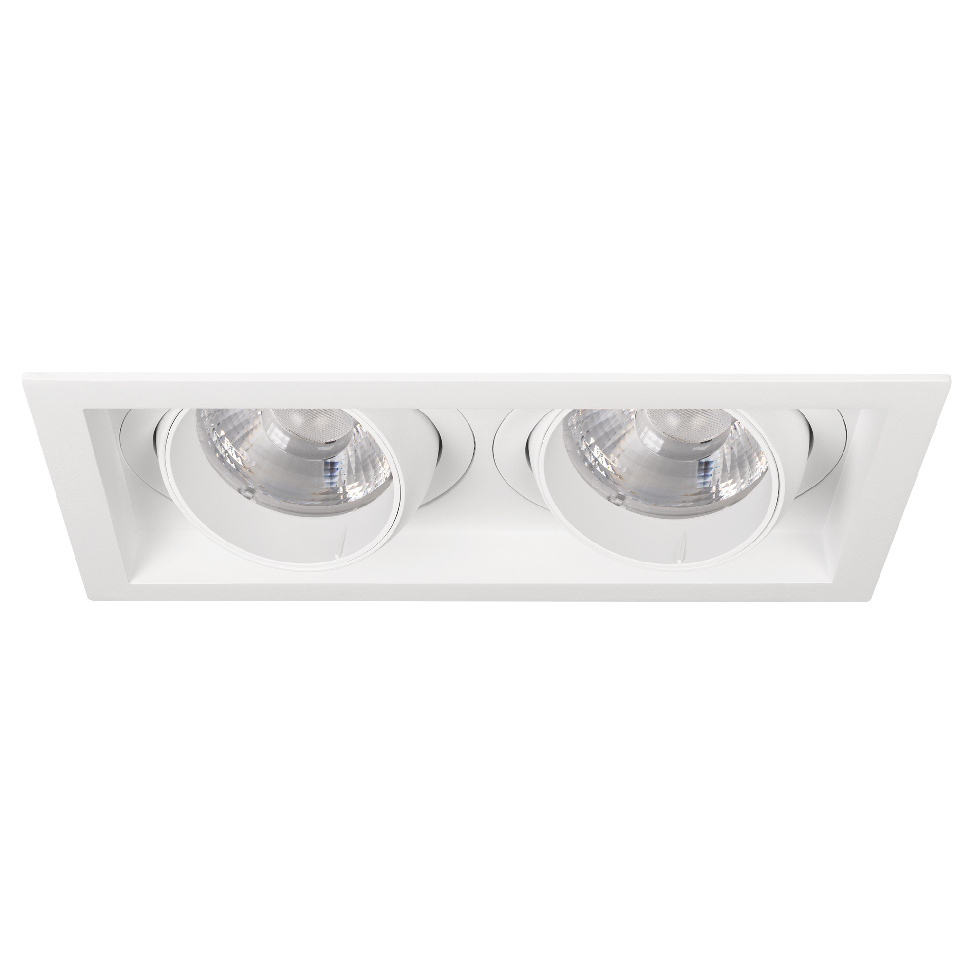 Встраиваемый карданный светильник. Мощность 2х30 Вт, св. поток 6520 лм, 108 лм/Вт, дневной 4000 K, CRI>92, угол 30°, напряжение питания 230 В. Белый корпус из алюминия, степень защиты IP20. Размер: длина 250 мм, ширина 140 мм, высота 125 мм. Монтаж встраиваемый, установочное отверстие: длина 230 мм, ширина 120 мм. Драйвер 24-42 В, 750 мА, пульсация <2%.