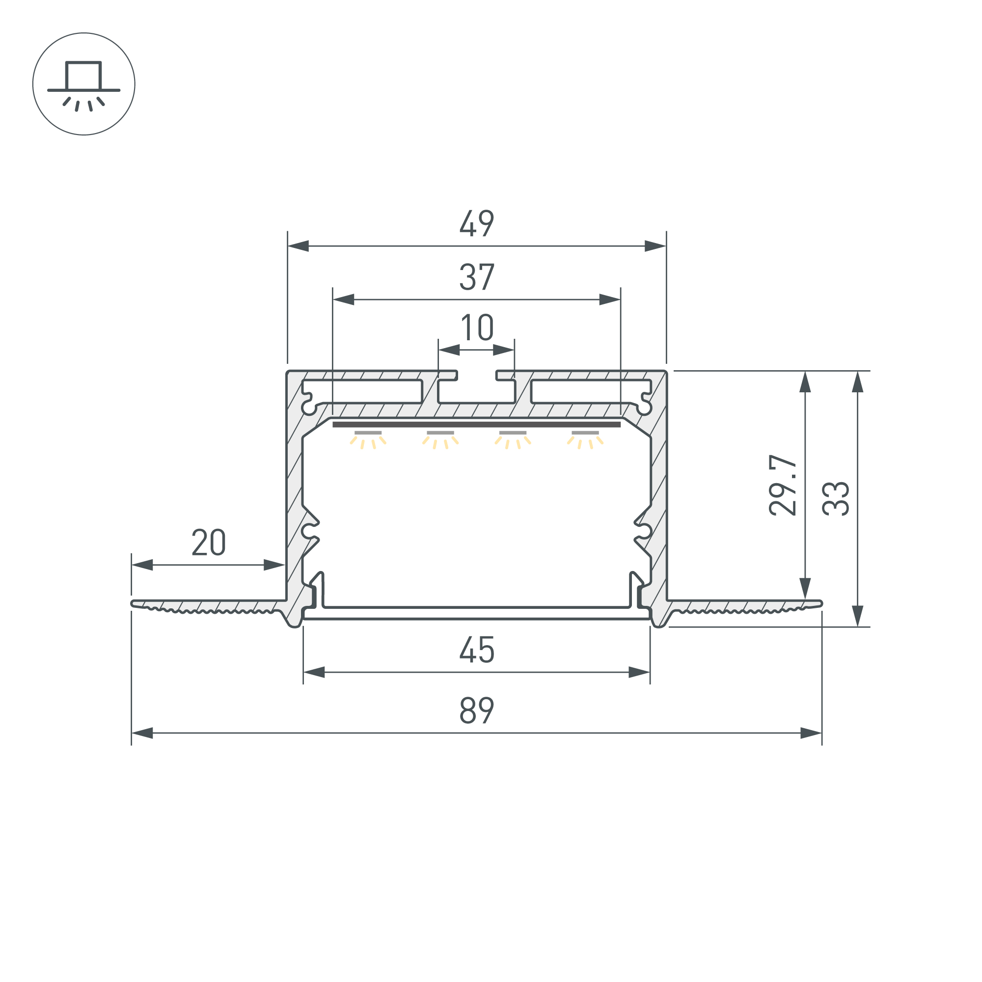 Встраиваемый профиль со скрытым фланцем из анодированного алюминия для создания линий света на потолке и стенах из ГКЛ. Габаритные размеры профиля составляют 2000 мм в длину, 89 мм в ширину и 33 мм в высоту, паз для установки 49 мм. Площадка для установки светодиодных лент позволяет использовать ленту шириной до 37 мм и мощностью до 53,6 Вт/м. Это обеспечивает гибкость в выборе светодиодных лент и создает потрясающие световые решения. Экраны, заглушки и другие аксессуары не включены в комплект и приобретаются отдельно. Цена указана за 1 метр профиля. Отличное решение для создания современных световых проектов.