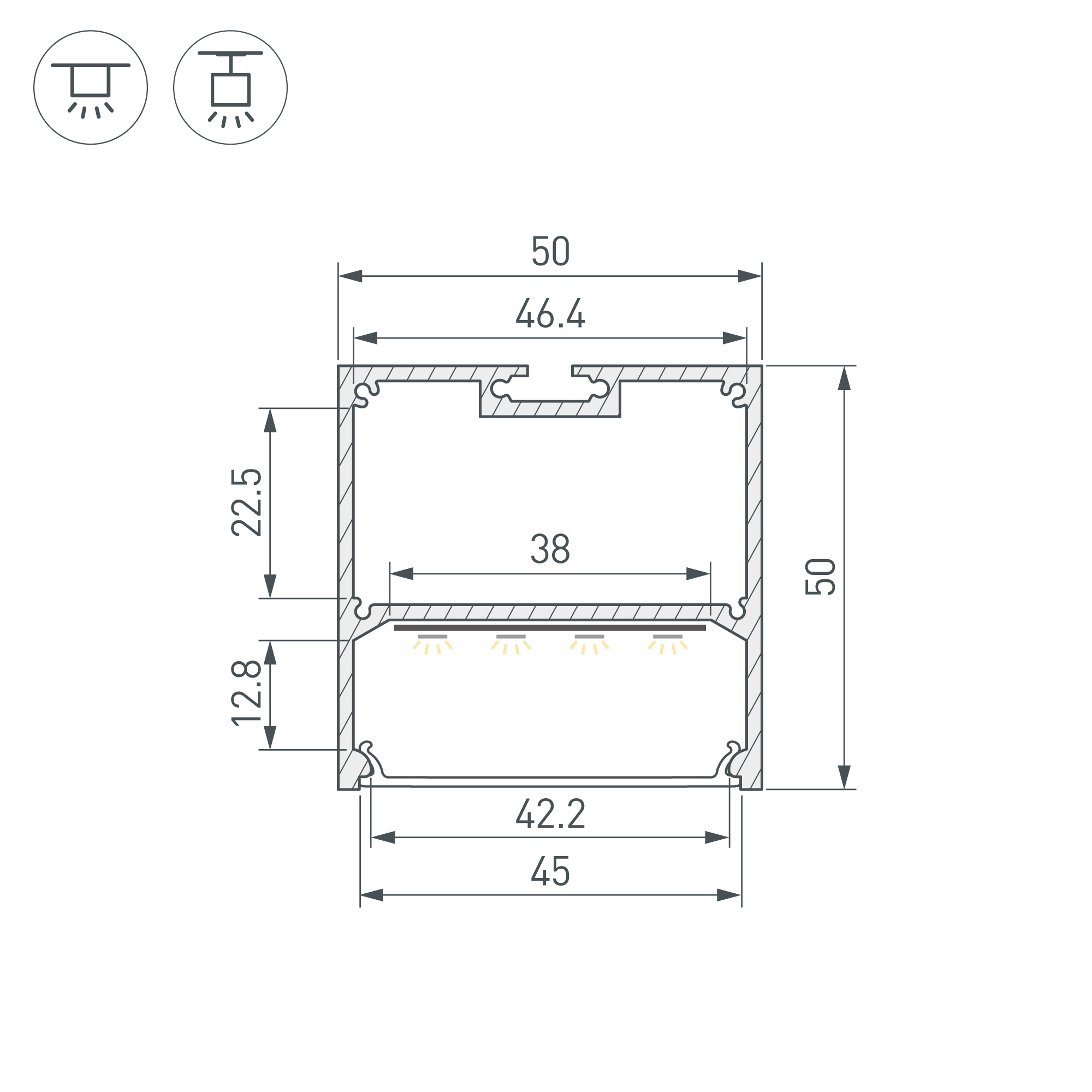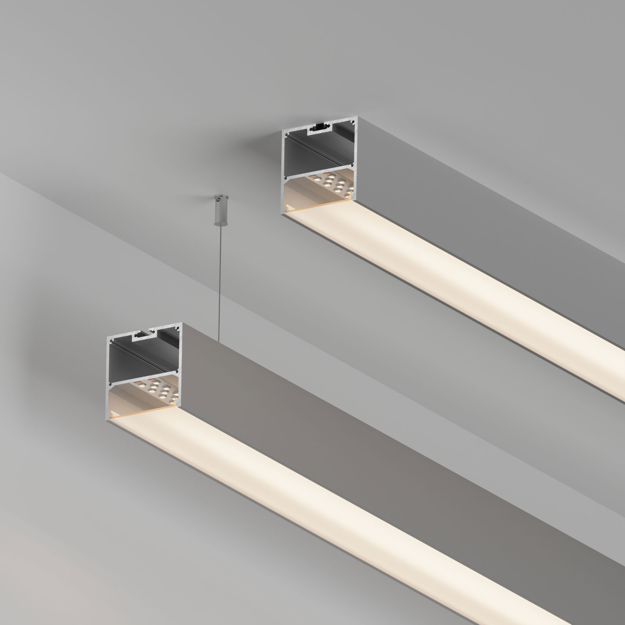 Подвесной/накладной профиль из анодированного алюминия для основной и контурной подсветки помещений, предназначен для установки светодиодных лент или линеек. Габаритные размеры профиля составляют 3000 мм в длину, 50 мм в ширину и 50 мм в высоту. Площадка для установки светодиодных лент позволяет использовать ленту шириной до 38 мм и мощностью до 52,5 Вт/м. Это обеспечивает гибкость в выборе светодиодных лент и создает потрясающие световые решения. Экраны, заглушки и другие аксессуары не включены в комплект и приобретаются отдельно. Цена указана за 1 метр профиля.