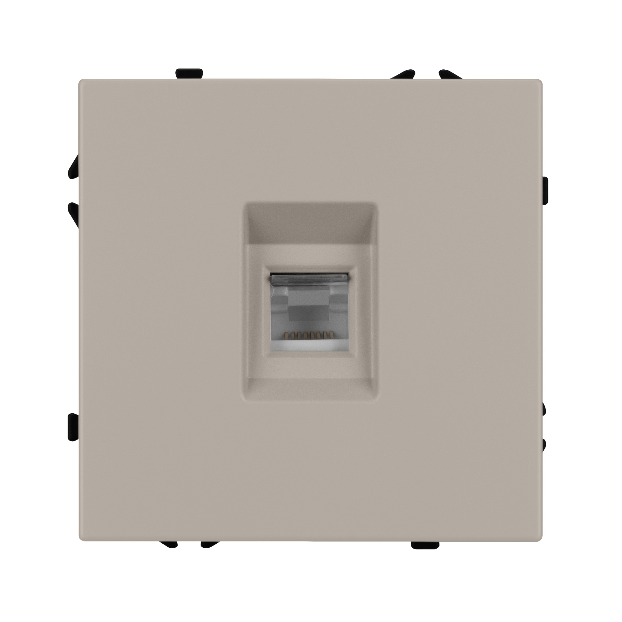 Строгие геометрические линии гармонично сочетаются с функциональностью продуманных механизмов, создавая идеальное решение для дизайн-проектов, где важны как эстетика, так и практичность. Механизм телефонной розетки совместим с рамками серии NOBE, создает утонченный минималистичный вид. Скрытый тип монтажа позволяет гармонично встроить в интерьер любого современного дизайн-проекта. Видимая часть механизма выполнена из высококачественного пластика цвета кашемир и имеет Soft-Touch покрытие, что придает изделию приятные тактильные ощущения и стильный внешний вид. Выходной порт RJ-11 (Female) формата 6P4C соответствует категории 3 (Cat.3). Самозакрывающаяся крышка защищает выходной порт от повреждения и загрязнения внешних контактов разъема. Контактная часть выполнена по технологии IPC (изоляционно–пробивающего контакта) с нанесением цветной маркировки схемы разводки на корпус, позволяя быстро и легко подсоединить механизм компьютерной розетки к большинству многожильных кабелей типа UTP (неэкранированные). А усиленные распорные лапки двойного захвата надежно фиксируют механизм в установочном подрозетнике круглого сечения диаметром 60мм. Суппорт окрашен в черный матовый цвет под основу механизма и выполнен из металла толщиной 1,5мм, что обеспечивает безопасность и уверенность в установке. На каждой стороне суппорта размещены фиксирующие элементы, позволяющие комбинировать механизмы в системы до 5шт как горизонтально, так и вертикально.
