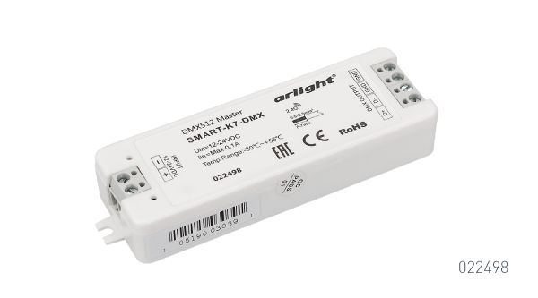 Миниатюрный мастер-контроллер SMART-K7-DMX позволяет управлять RGB и RGBW светодиодными лентами, светильниками и модулями с DMX-управлением. При использовании лент без DMX-входа, их можно подключить через любой совместимый DMX-декодер. Модель имеет компактные размеры, поэтому ее легко незаметно разместить в интерьере. Контроллер содержит в памяти 32 встроенные динамические программы, позволяет управлять яркостью света и скоростью смены сценариев.
