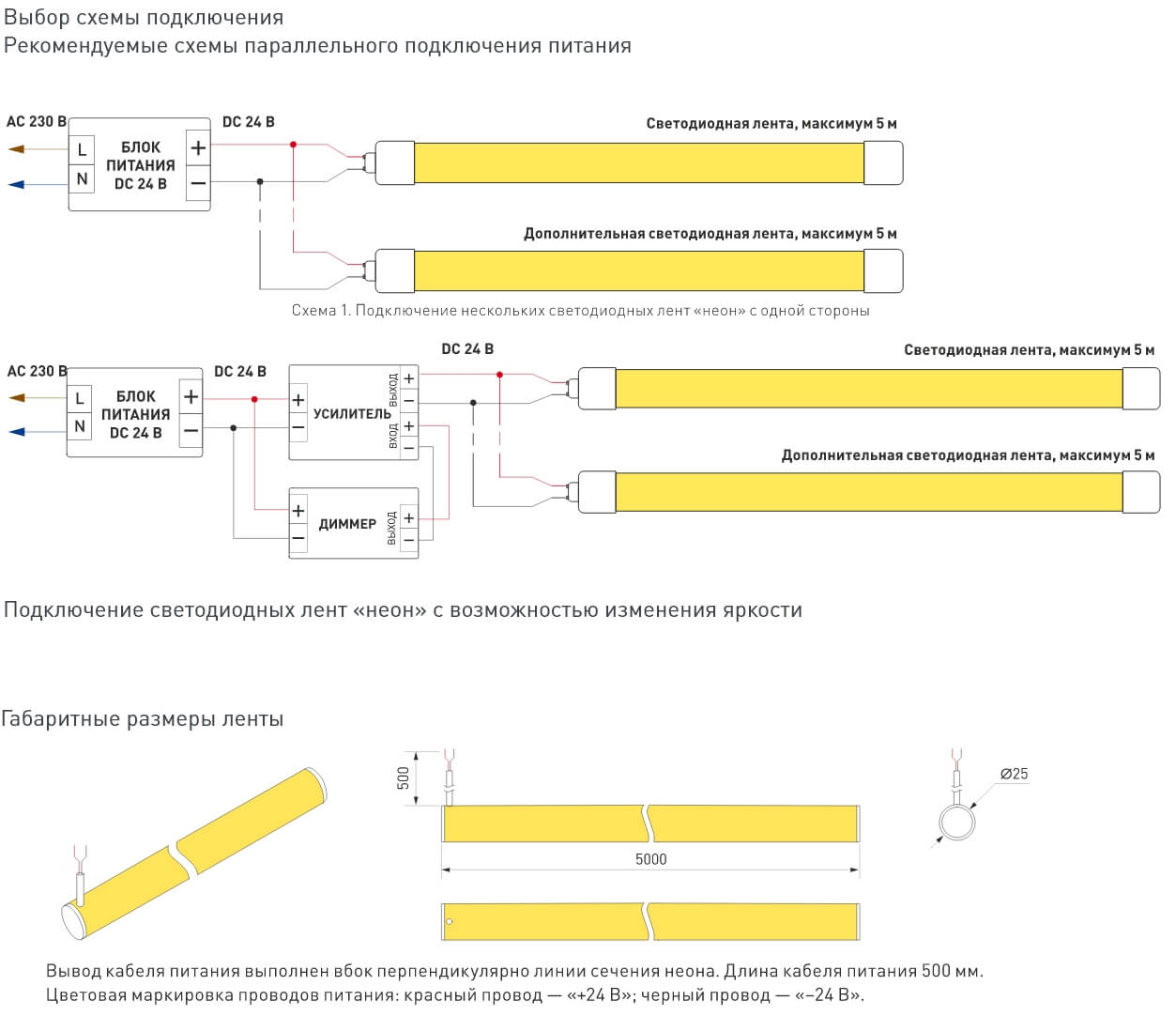 Два типа вывода кабеля (под прямым углом к оси неона и прямой вывод по оси неона) расширяют технические возможности применения.