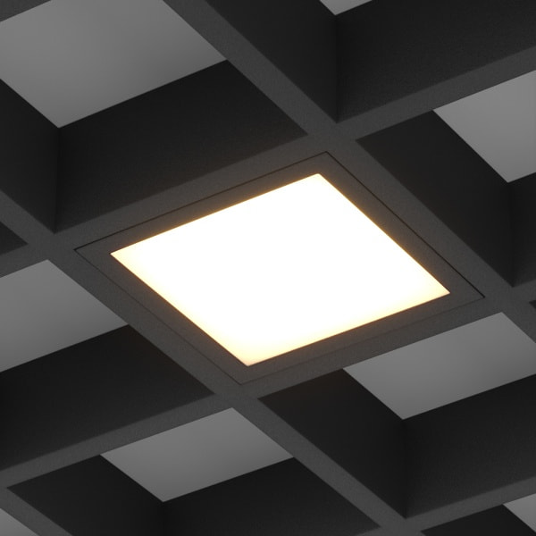 Квадратный корпус представлен в черном и белом цвете, что позволяет подобрать нужную модель для интерьера. Благодаря универсальной конструкции светильник можно монтировать в потолок с высотой направляющих 30, 40 и 50 мм.