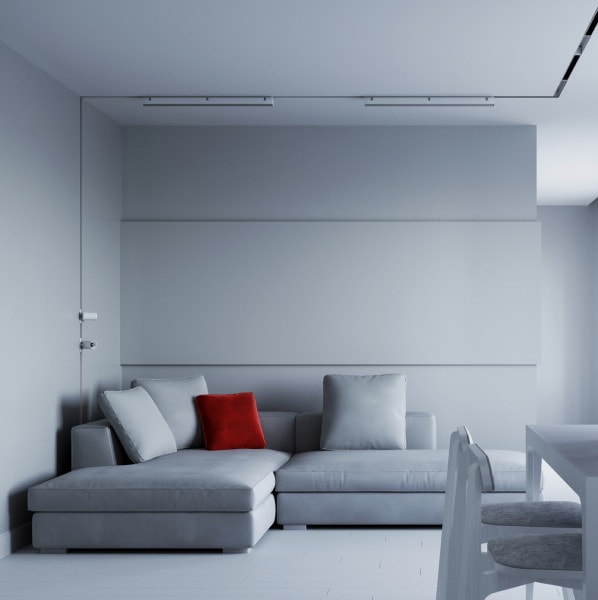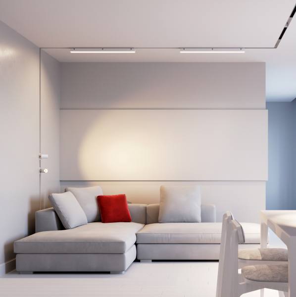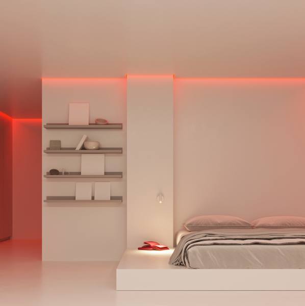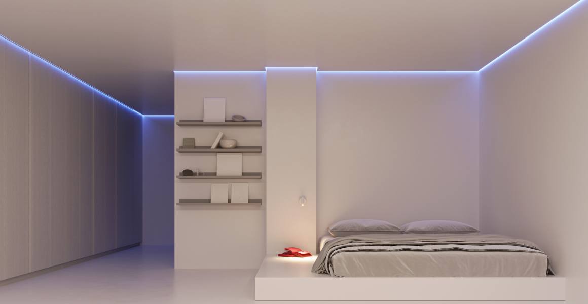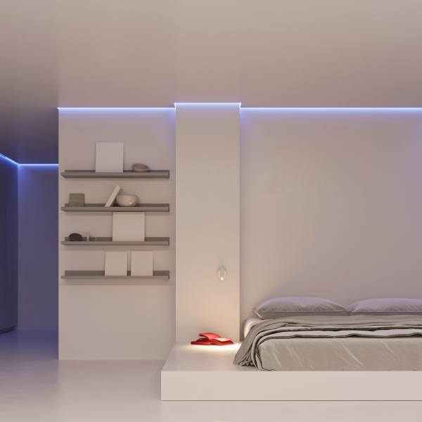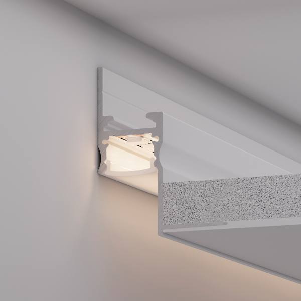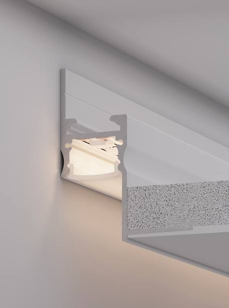 Профиль со скрытым фланцем встраивается в потолки и потолочные ниши из гипсокартона, образуя теневой зазор между потолком и стеной. Такое решение является отличной альтернативой привычным карнизам и создает визуальный эффект потолка, «парящего» в воздухе, с мягким свечением по периметру комнаты.