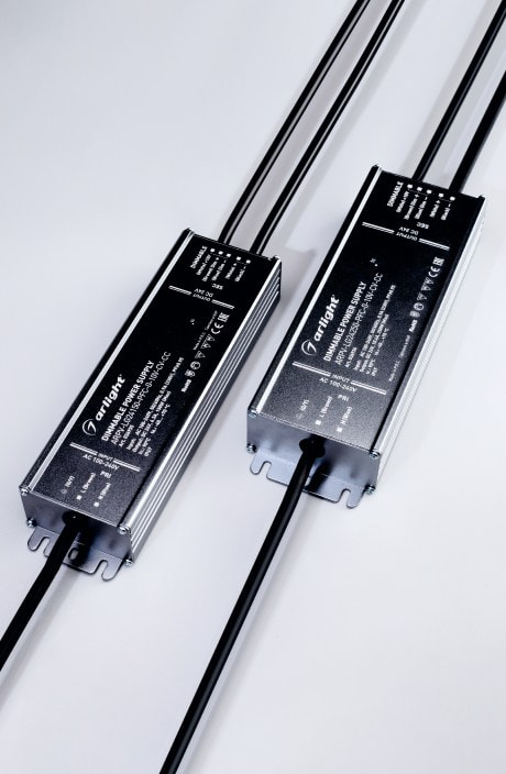 В отличие от классических диммируемых источников напряжения новинки блоки питания серии ARPV–LG работают в режиме постоянного напряжения (CV) с переходом на постоянный ток (CC). За счет этого на выходе создается аналоговый сигнал (не ШИМ), что обеспечивает бесшумную работу, в том числе и при диммировании магнитных трековых систем MAG-25, MAG-45.
