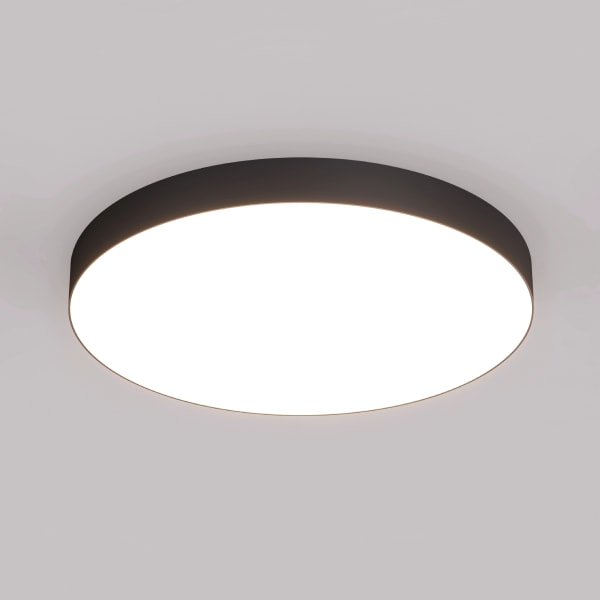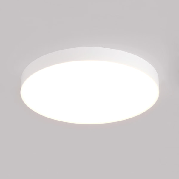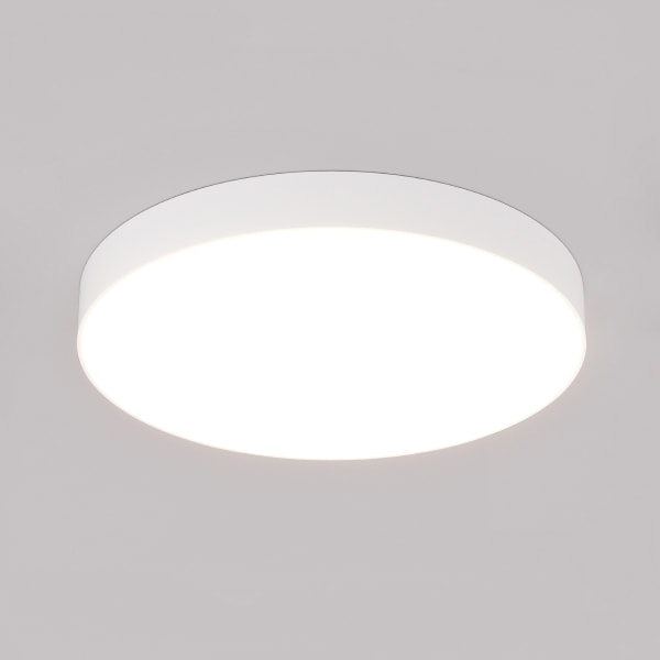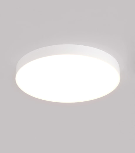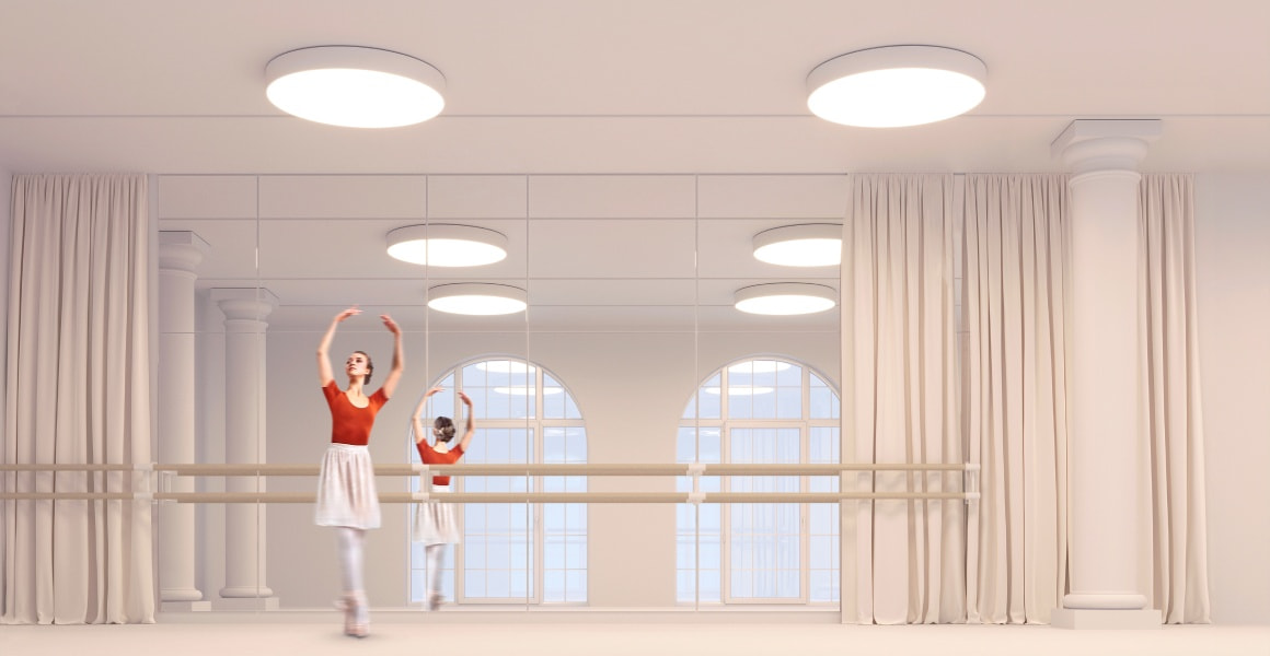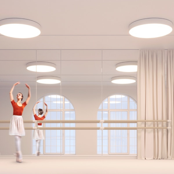 Создание качественного освещения в просторных помещениях с высокими потолками — основная задача светильников серии PLATO. Диаметр круглого корпуса в зависимости от модели составляет 1000 или 1200 мм. В качестве экрана на светильник установлено полотно натяжного потолка.