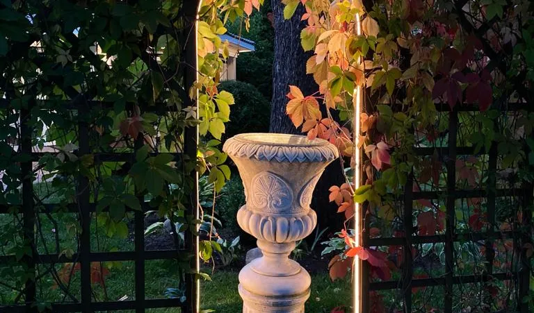 Для оформления фасада дома, а также подсветки декоративной арки в саду была применена герметичная лента со сплошным излучением по всей длине. Такое решение, несмотря на свою предельную простоту, смотрится дорого и эффектно.
