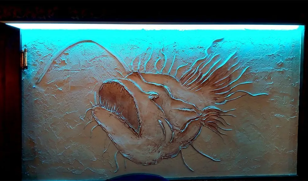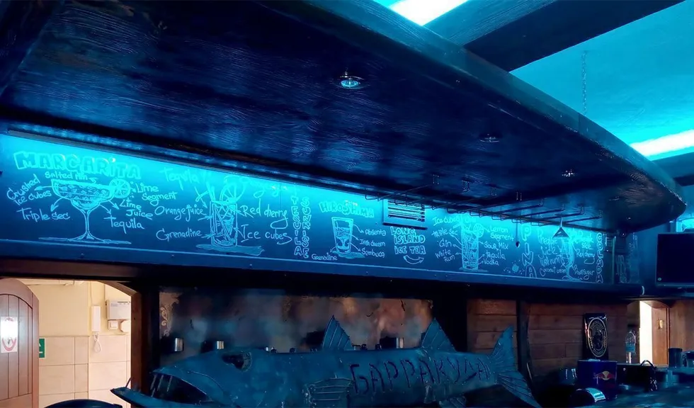 "Морскую" атмосферу создала в баре светодиодная подсветка бирюзового цвета.