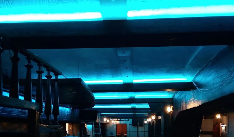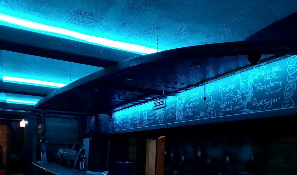 Подчеркнуть выбранную стилистику призвана светодиодная подсветка, которая создала эффект нахождения под водой. Для этого светодиодная лента RGB arlight® была установлена в декоративные, имитирующие дерево, балки под потолком. Лента была также установлена для освещения стенки вентиляционного короба, который одновременно служит для написания барного меню.