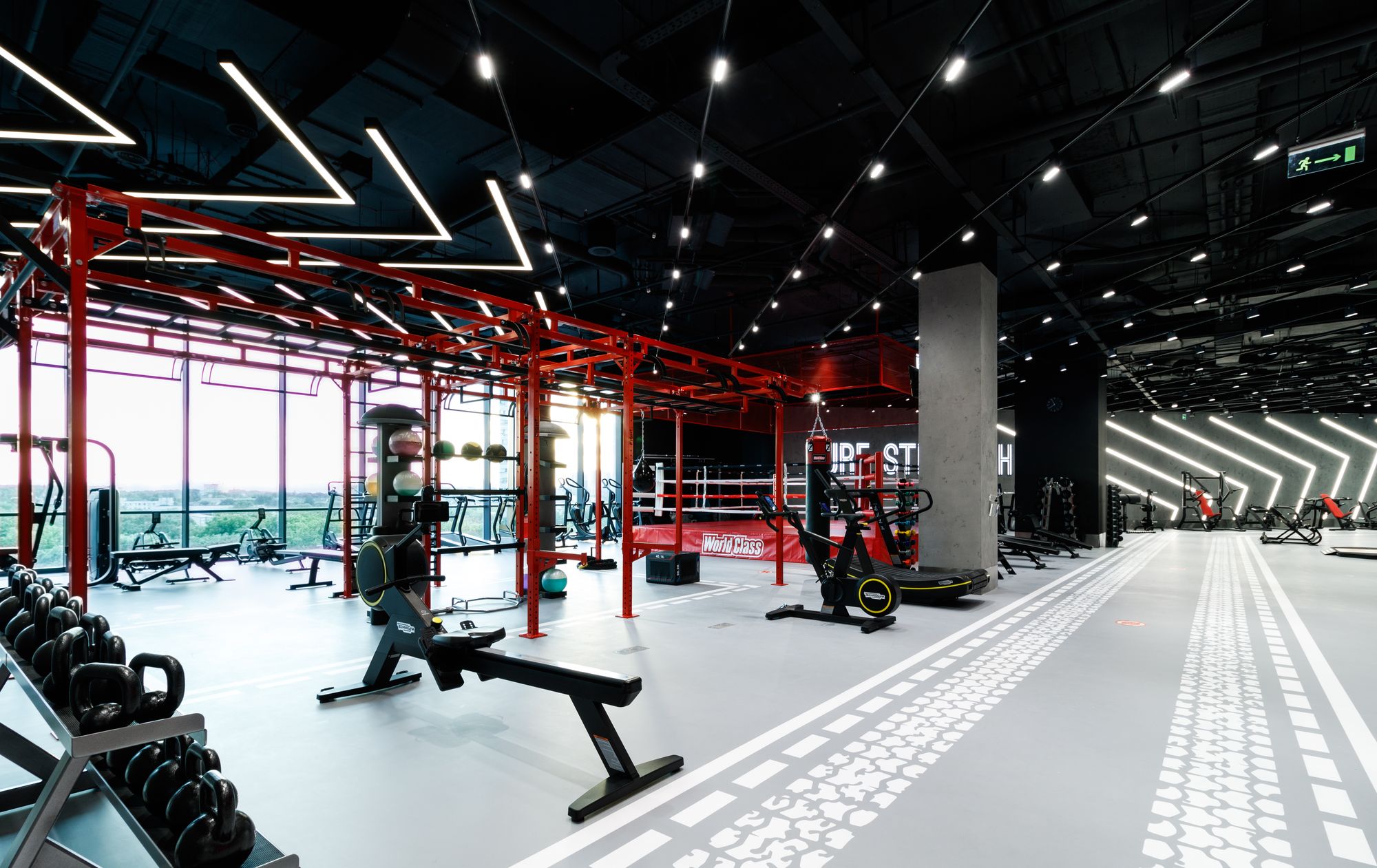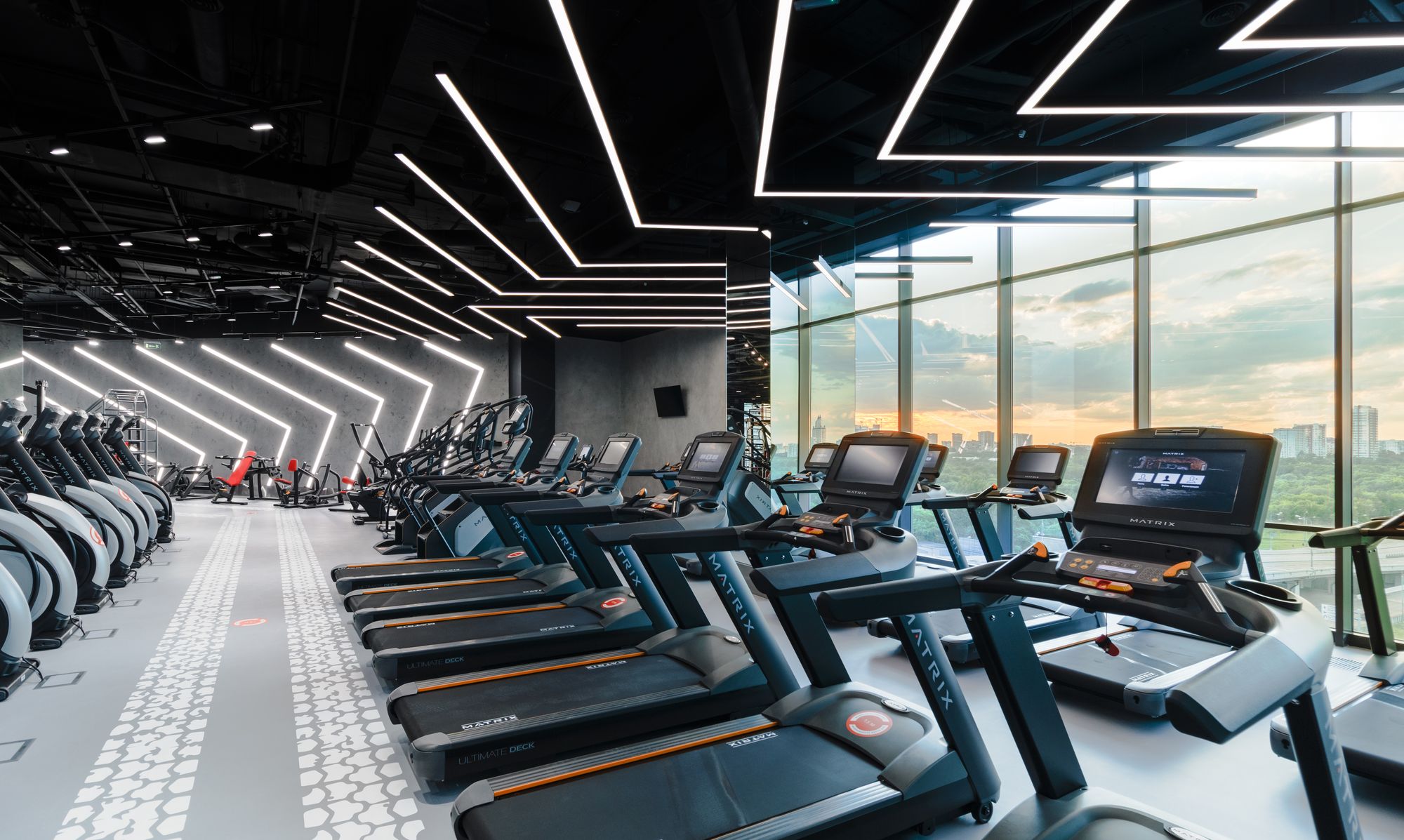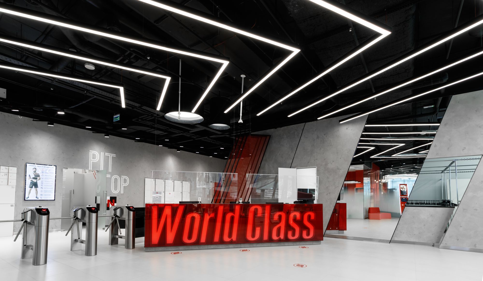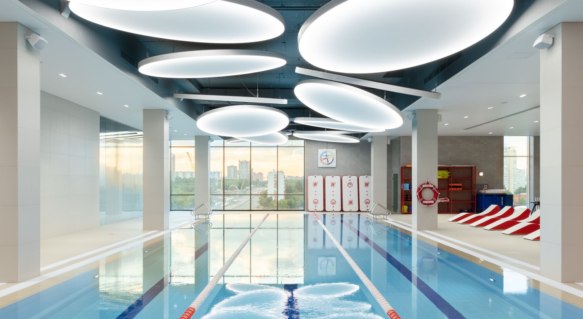 Уникальное пространство, в котором интересно сочетаются разные типы основного освещения и декоративной подсветки. Для проекта было использовано более 30 единиц светодиодного оборудования. Огромные потолочные диски светильников сочетаются с линейными и дизайнерскими подвесными светильниками. С помощью света удалось подчеркнуть масштаб, красоту и легкость интерьеров. Круглые потолочные светильники в зоне бассейна похожи на полную луну. Ломаные линии света напоминают летящие стрелы или разметку бегового стадиона. Светодизайнерам удалось создать пространство, в котором сплелись качественный белый свет и световые иллюзии.