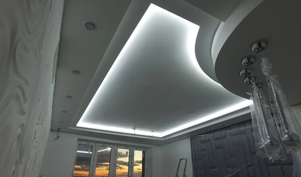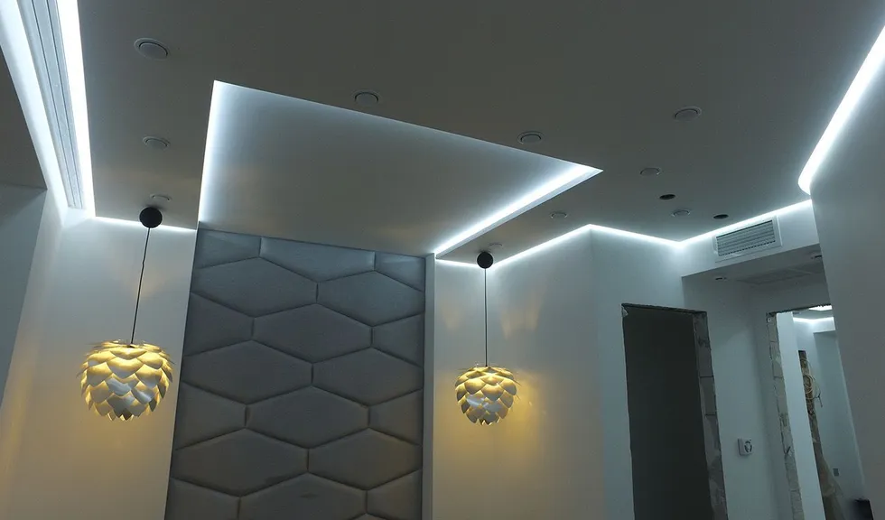 Задачей данного проекта являлось создание фонового освещения по всей квартире. Для этого во многочисленные объемные ниши потолка была установлена светодиодная подсветка.