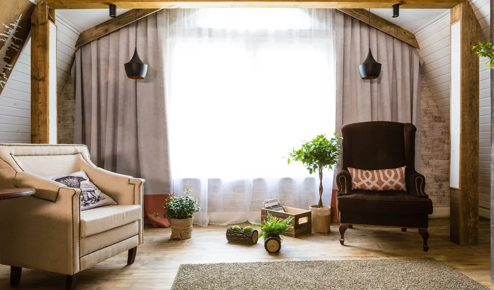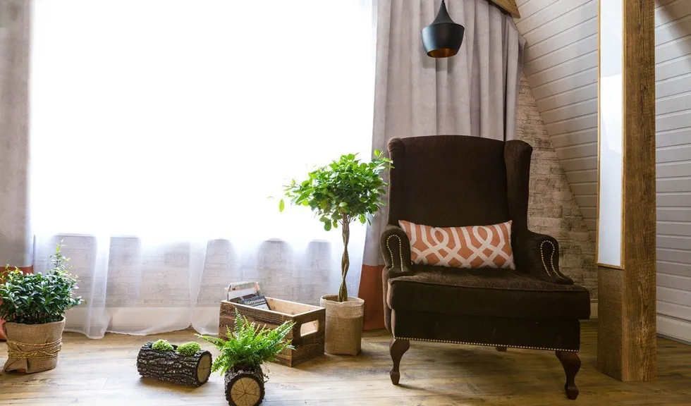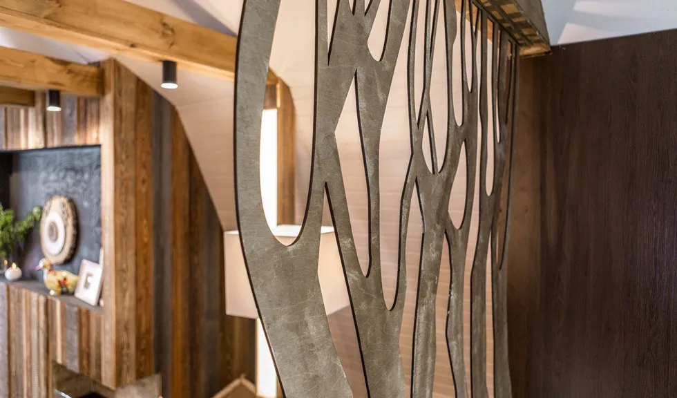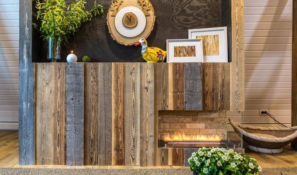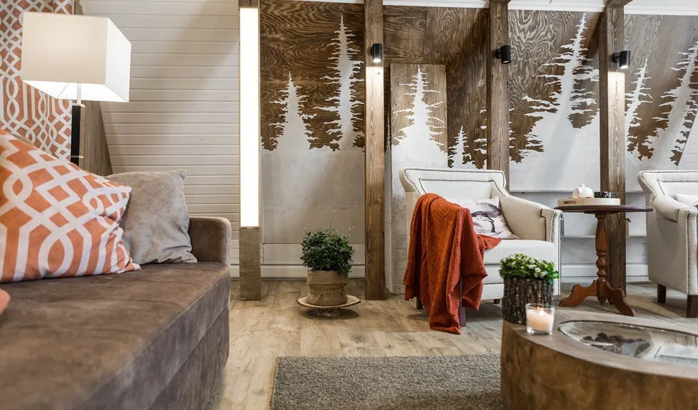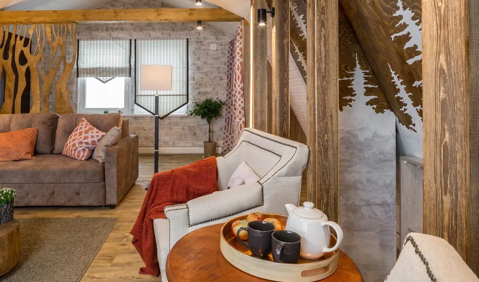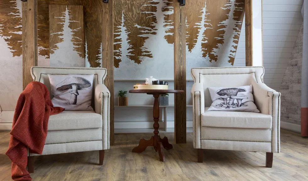 Новые идеи в телепроекте "Фазенда" на мансарде в 42 квадратных метра появилась лесная гостиная. На стене – лес еловый. Есть даже пенек. Перегородка - с осиновой рощей… Дерево, камень, камин. Почти классическое шале. Освещение в гостиной реализовано различными светодиодными светильниками.