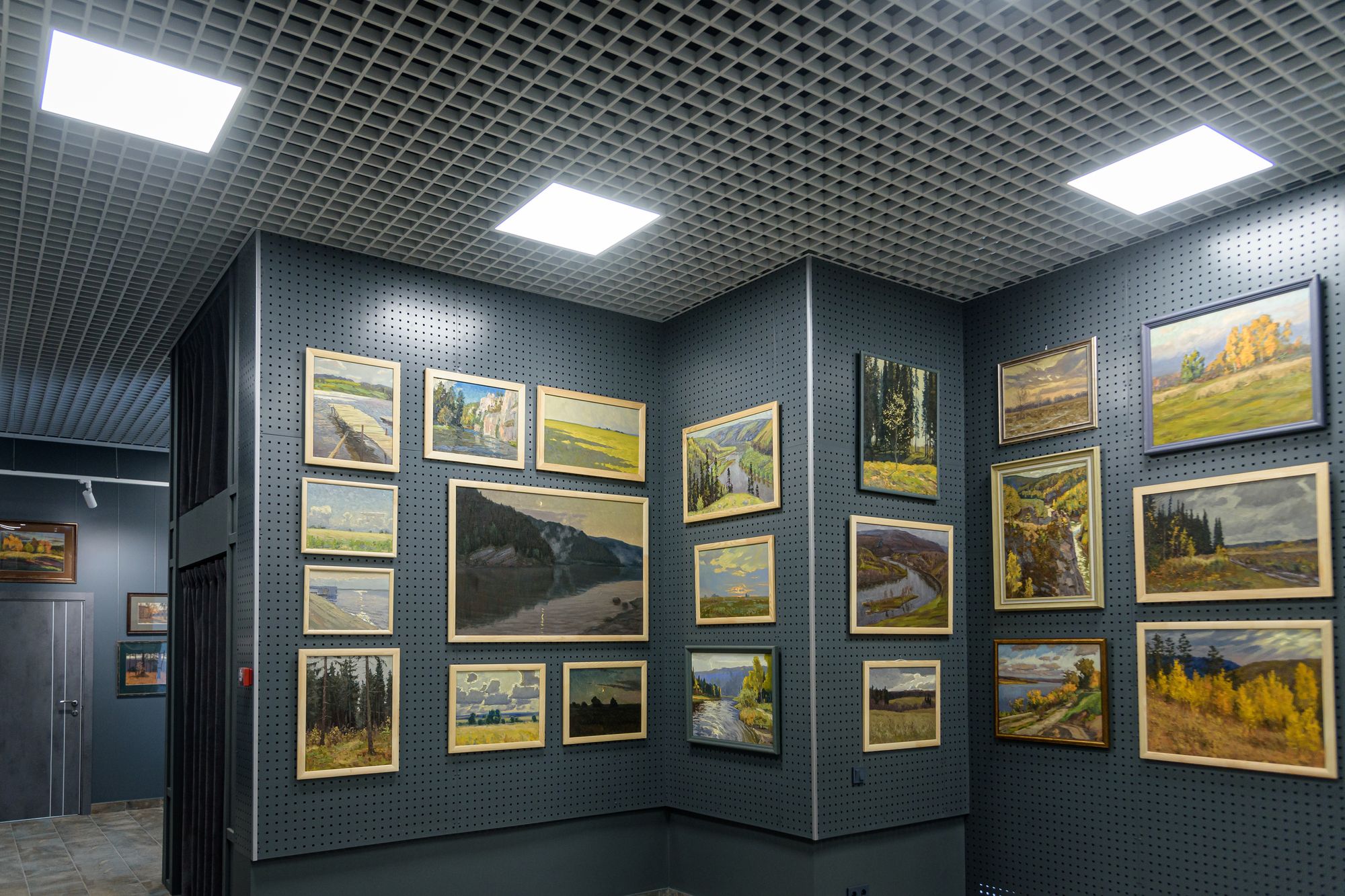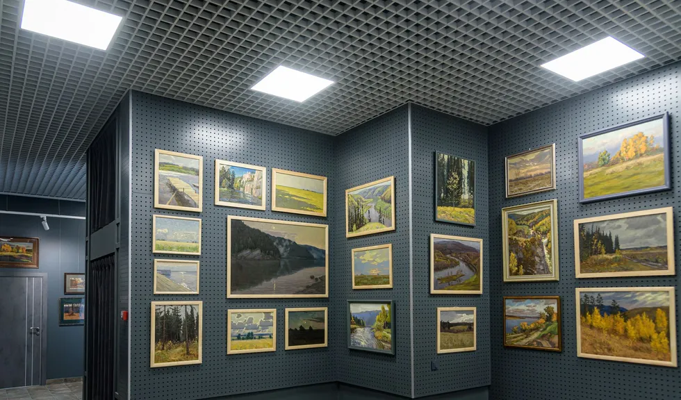 Особенностью проекта является многофункциональность: в рамках единого пространства было необходимо создать комфортную и удобную световую среду для проведения любых мероприятий, презентаций и выставок. Дизайнерская задумка реализована с помощью трековых светильников с регулируемым углом излучения. Основная потолочная подсветка создана с помощью светодиодных панелей с изменяемой цветовой температурой. В выставочных помещениях важна быстрая смена световых акцентов, поэтому трековые светильники, которые свободно перемещаются вдоль шины — идеальное решение. Для подсветки внешних оконных витрин используются накладные прожекторы, создающие оригинальную декоративную подсветку картин.