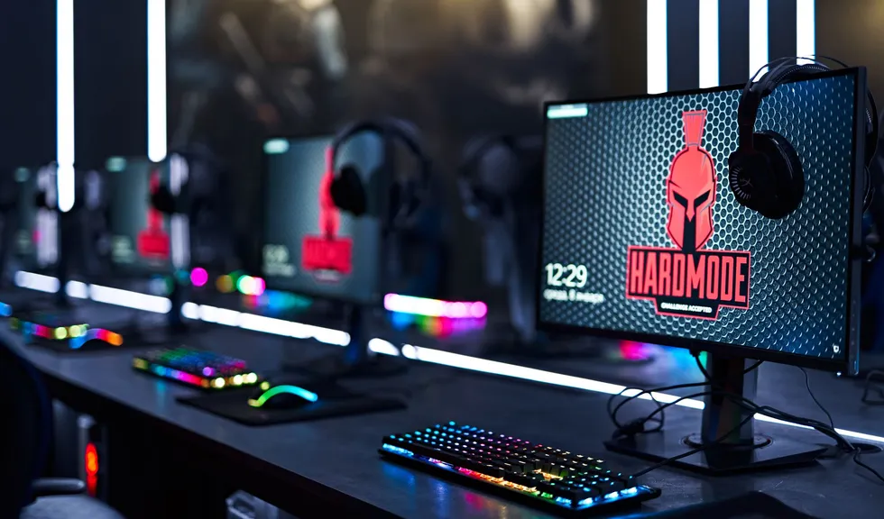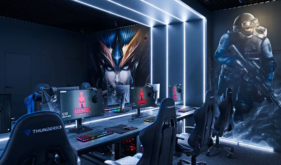 Световые линии интегрированы в стены, потолок и столы. Многоцветная RGB-лента, размещенная в компьютерных столах, управляется контроллером. Полосы света, которые плавно переходят со стен на потолок, напоминают портал, переносящий из реальности в параллельный мир. Игра контрастов впечатляет: темное помещение, яркие световые полосы и масштабные подсвеченные граффити на стенах. Персонажи игр словно находятся в движении за счет грамотно подобранных световых акцентов. Все пространство превращается в настоящую игровую арену, которая объединяет профессионалов и любителей киберспорта.