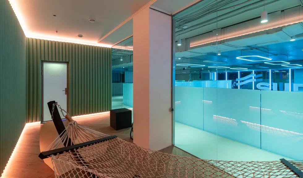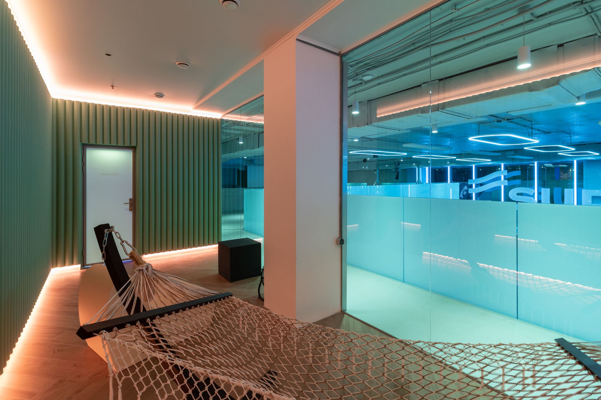 Подвесные светильники из дугового профиля управляются по протоколу DALI и DMX512 с возможностью реализации динамического освещения под фоновую музыку. В серфинг-центре предусмотрены датчики движения в проходных зонах и аварийное освещение.