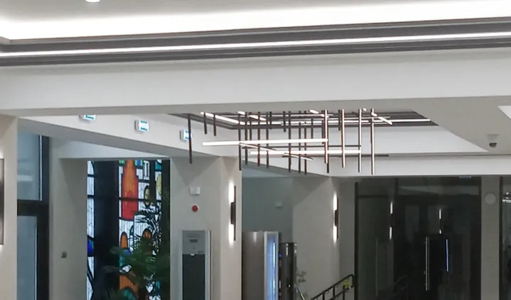 Для декоративной подсветки были выбраны линейные светильники, созданные на базе анодированных профилей и светодиодной ленты белого свечения. Основное освещение реализовано с помощью встраиваемых круглых потолочных светильников и широких световых полос. Основой светотехнического проекта стали лаконичность, минимализм и простая геометрия линий.