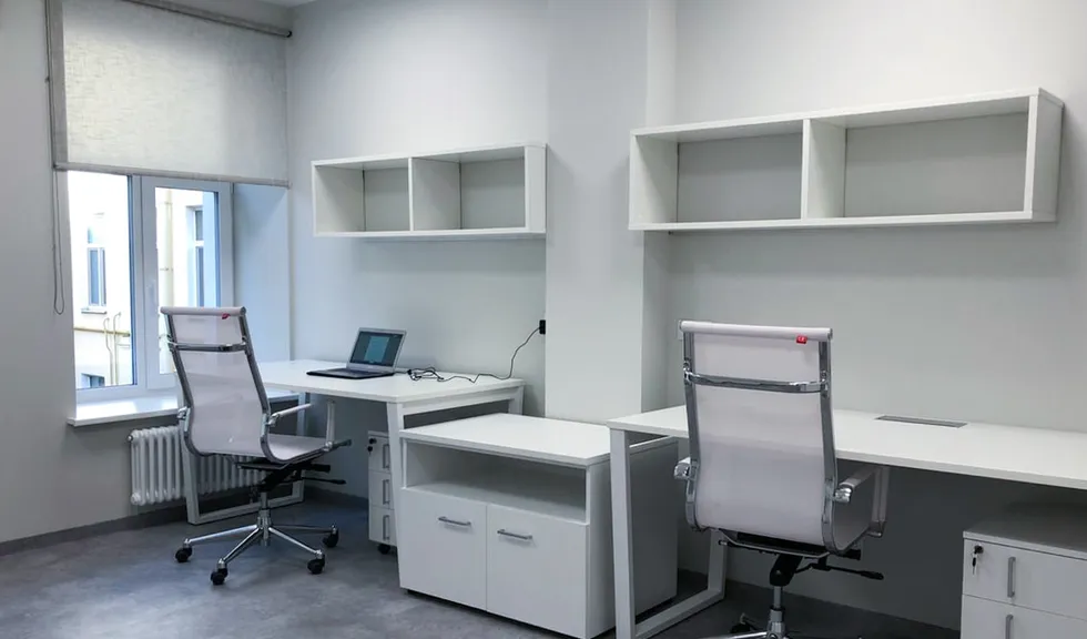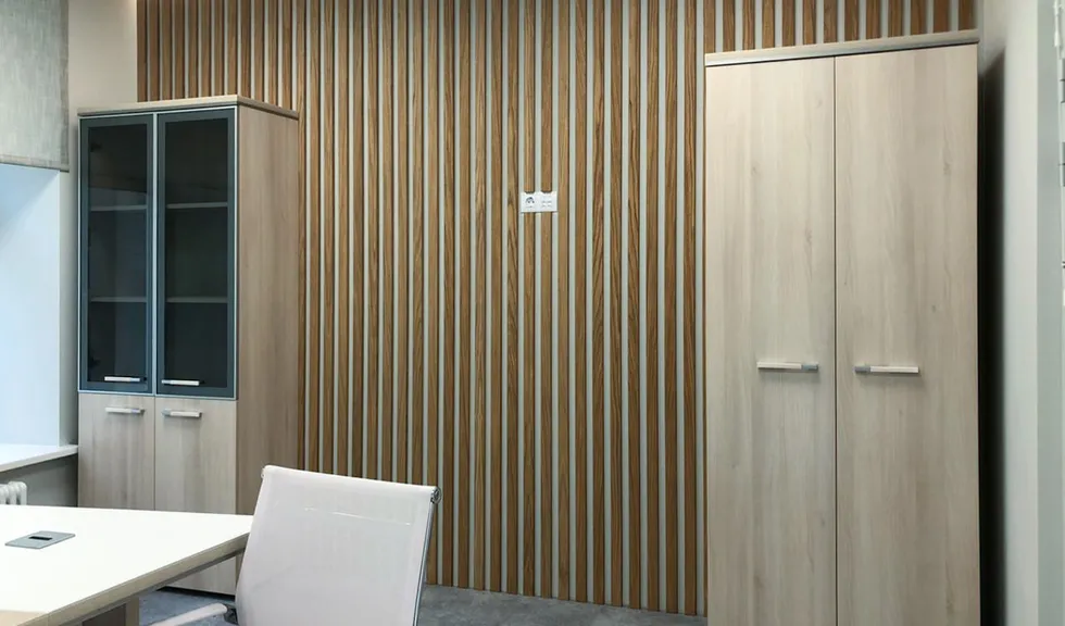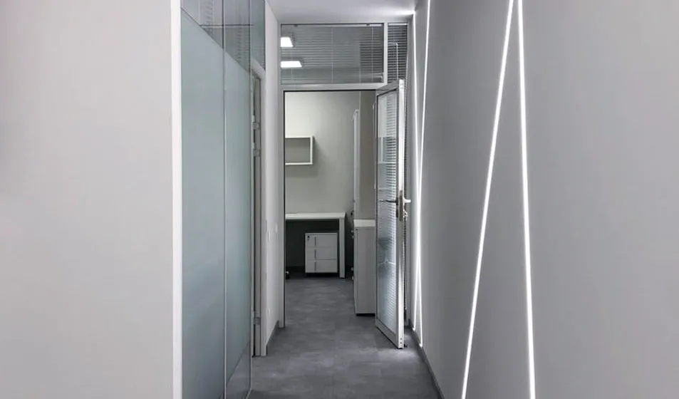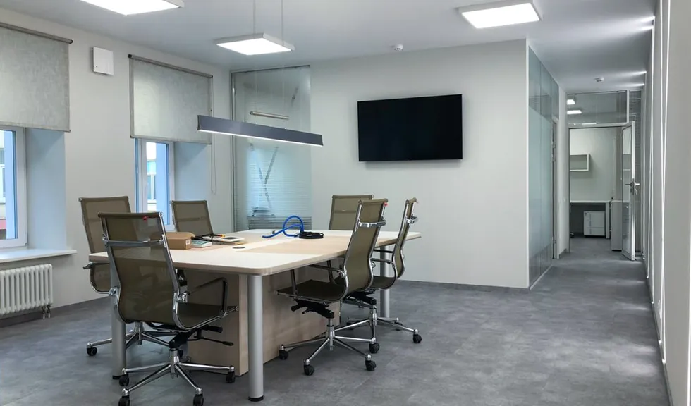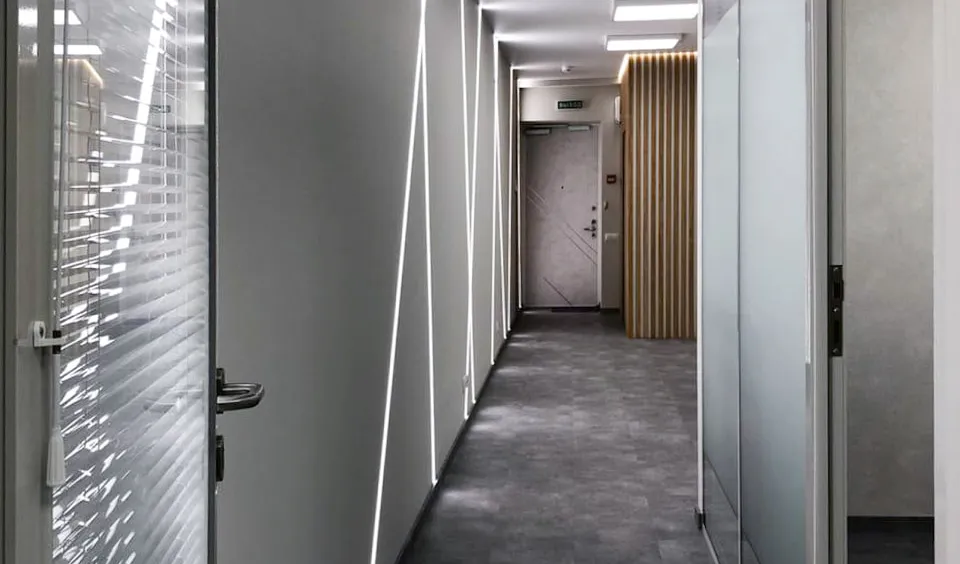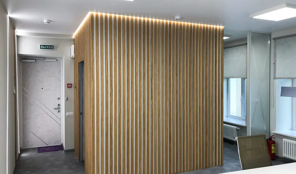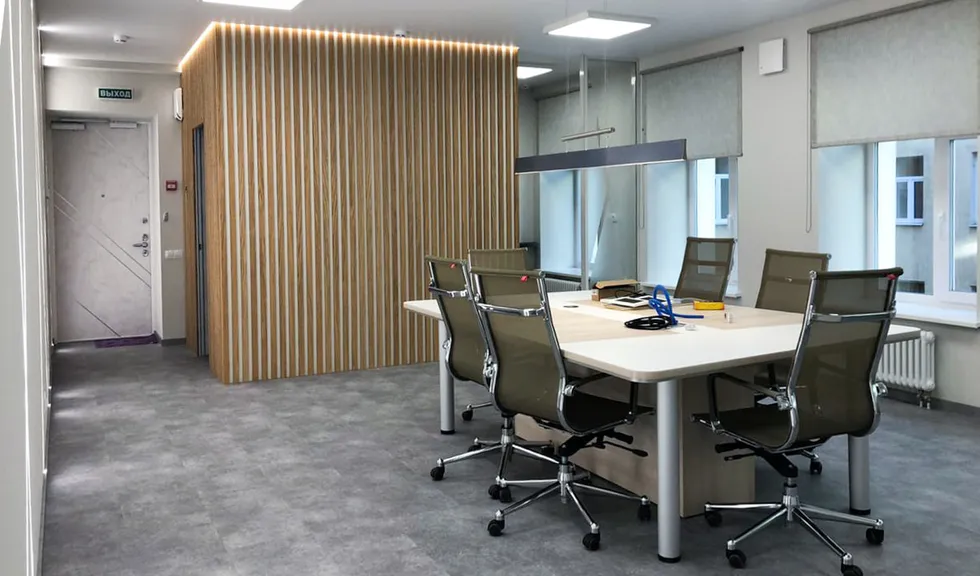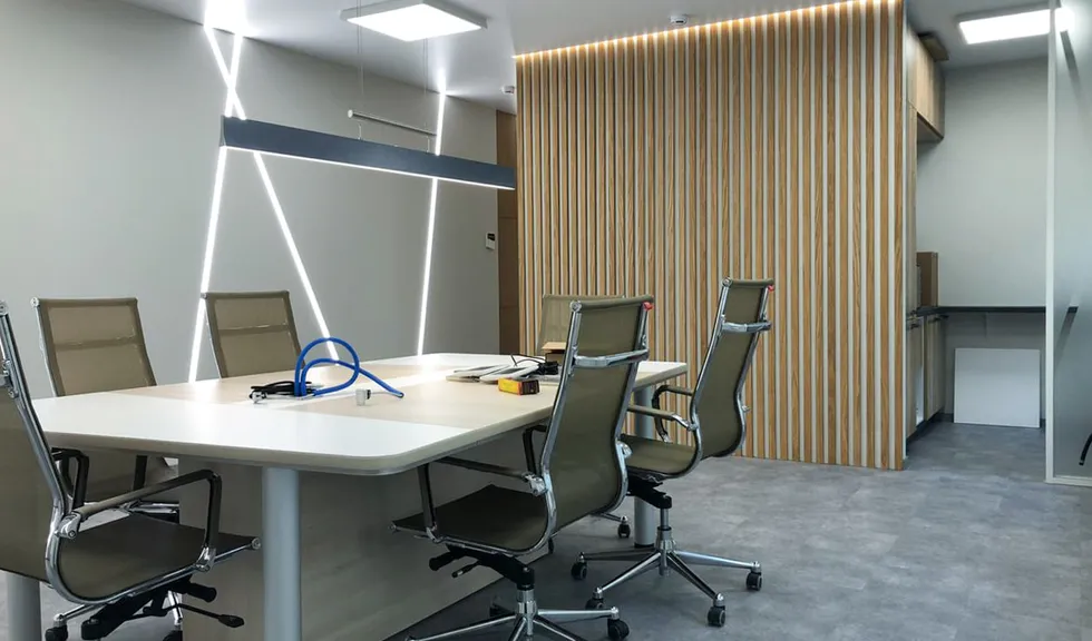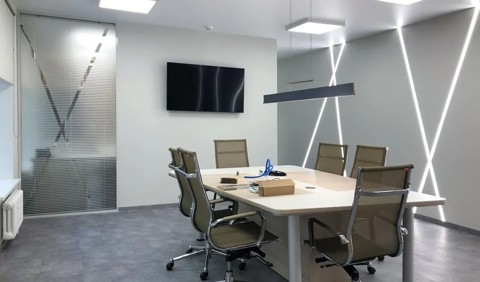 Чтобы создать достаточный уровень освещенности в разных помещениях, использовали разные по интенсивности и назначению источники света. Для основного освещения — накладные потолочные панели. Над столом для переговоров — лаконичный линейный светильник, выполненный из профиля черного цвета. Освещение в этом проекте выполняет не только основную функцию, но и выступает в качестве оригинального декора. Самая длинная стена офиса эффектно подчеркнута тонкими пересекающимися линиями света, которые создают на поверхности динамичный графический рисунок. В остальных помещениях реализована подсветка с теплым белым свечением, создающая уютную атмосферу. За счет использования разных источников света в каждом помещении офиса получилось создать логичную и оригинальную систему освещения, которая комфортна для сотрудников и посетителей.