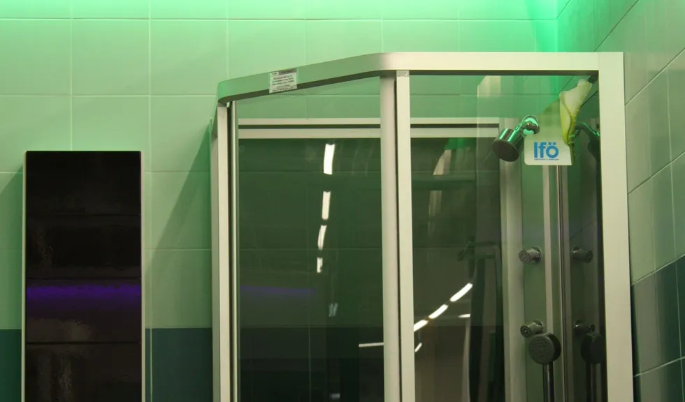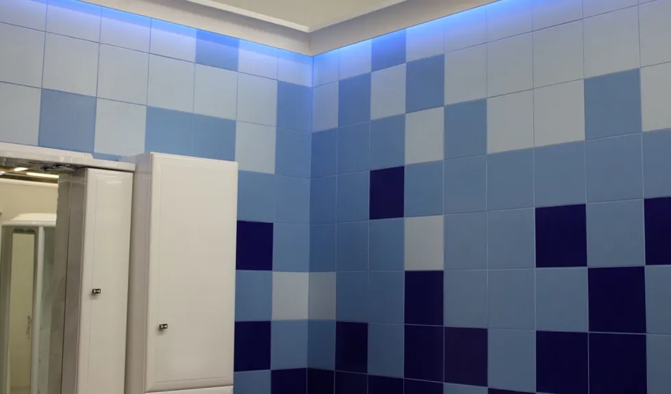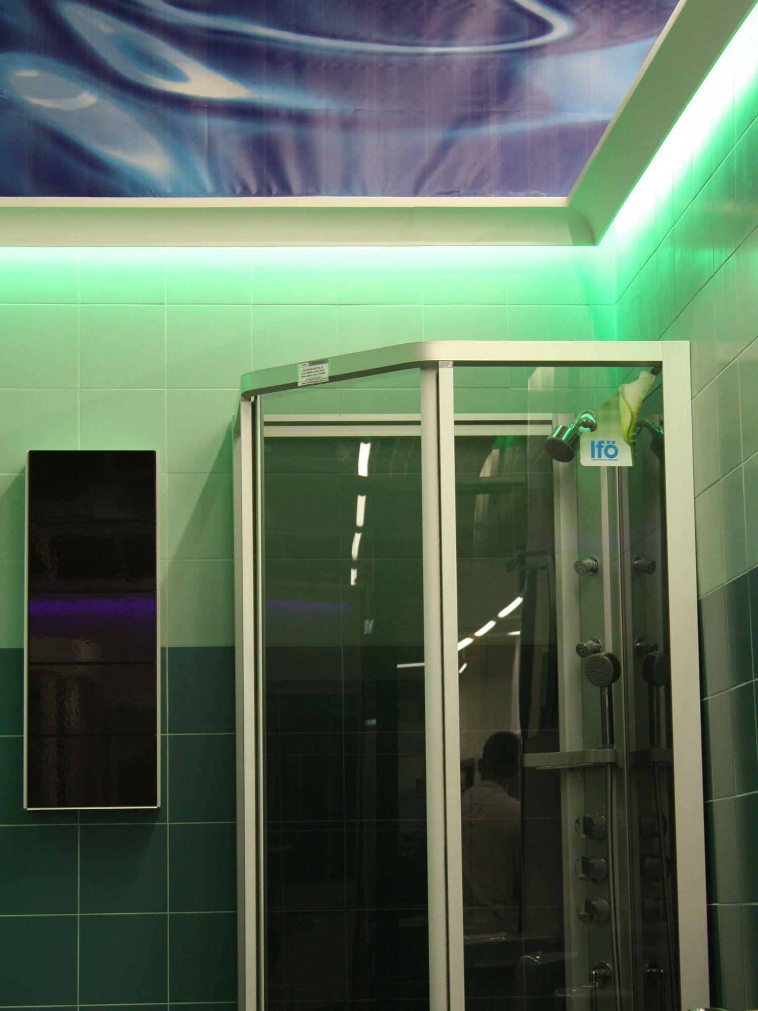 Цвет свечения светодиодной ленты был подобран для каждого стенда в соответствии с демонстрируемым интерьером и его цветом. Например, для ванной комнаты, в которой преобладает синий цвет была выбрана синяя подсветка, зелёная подсветка для интерьера с соответствующими цветами.