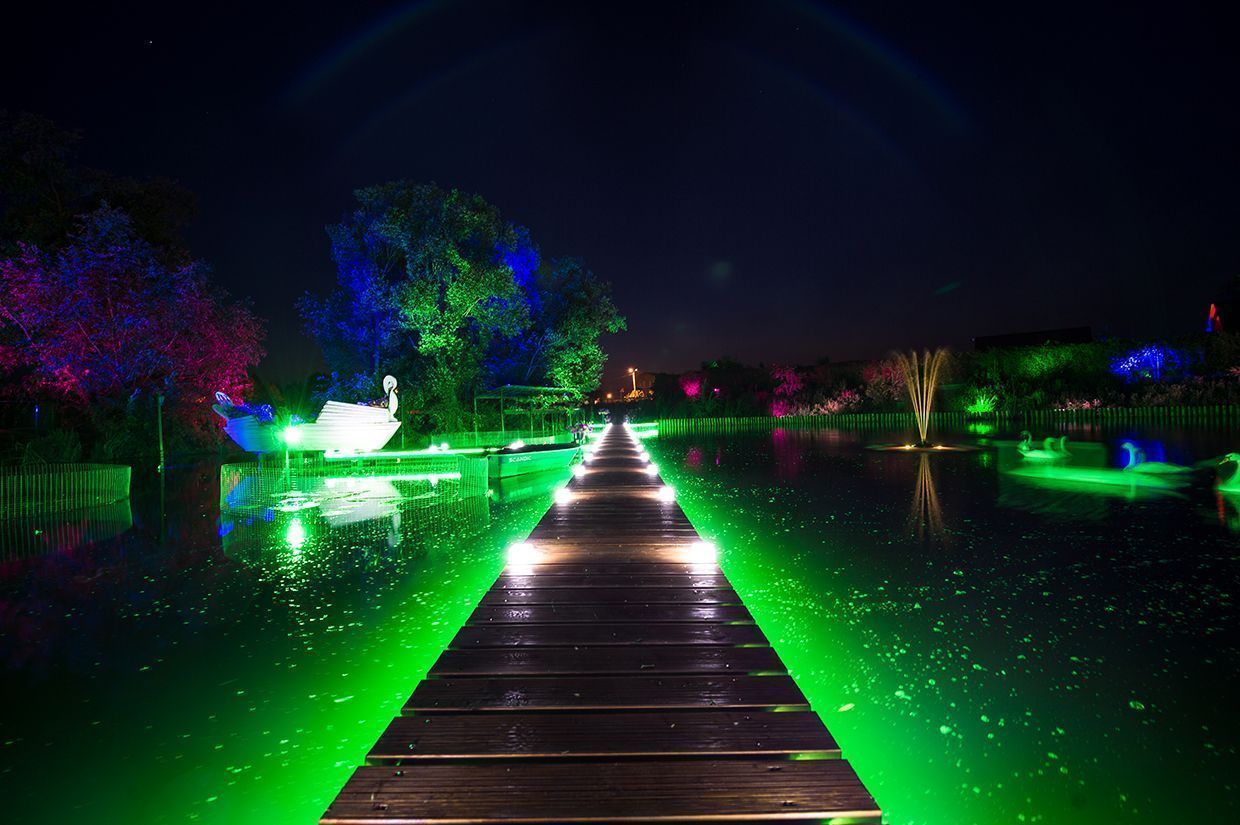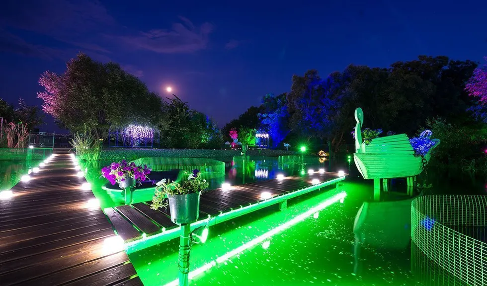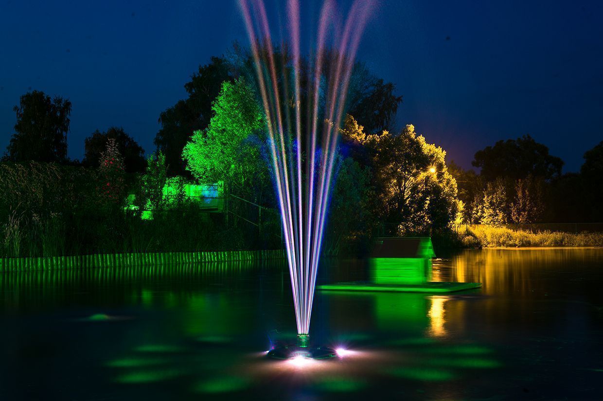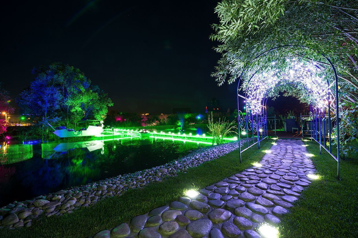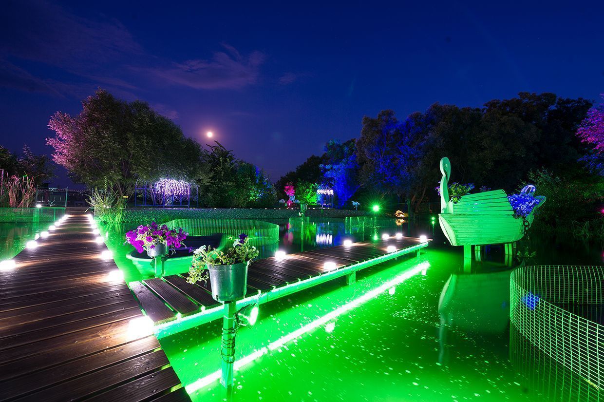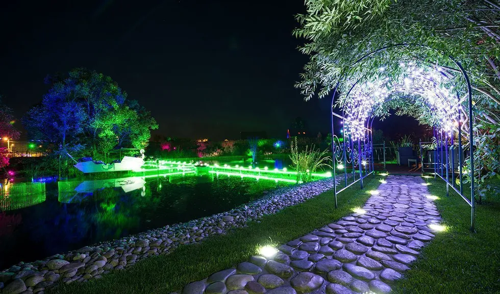 Для подсветки декоративного водоёма (пруда) применена многоцветная RGB светодиодная лента arlight®, защищённая от влаги со степенью защиты IP67. Лента закреплена с нижней стороны мостков. Управление осуществляется при помощи многозонного пульта ДУ arlight® - SR-2819T8 Black с сенсорным управлением в сочетании с RGB контроллерами arlight® - SR-1009EA.