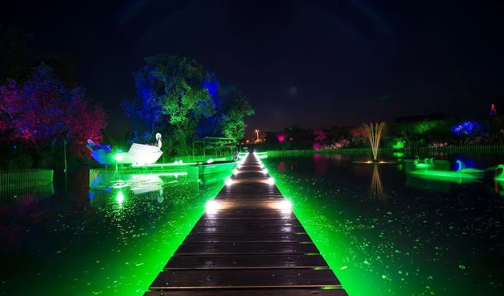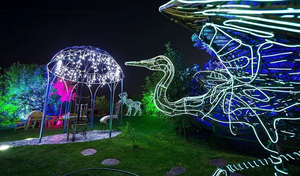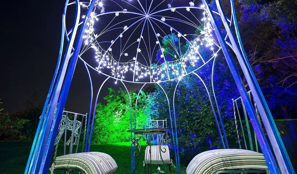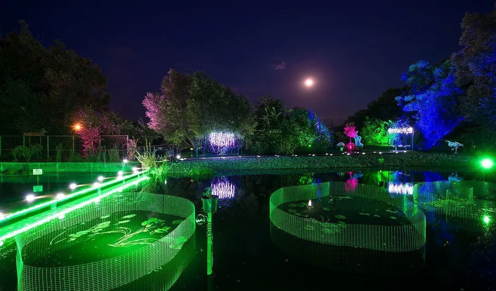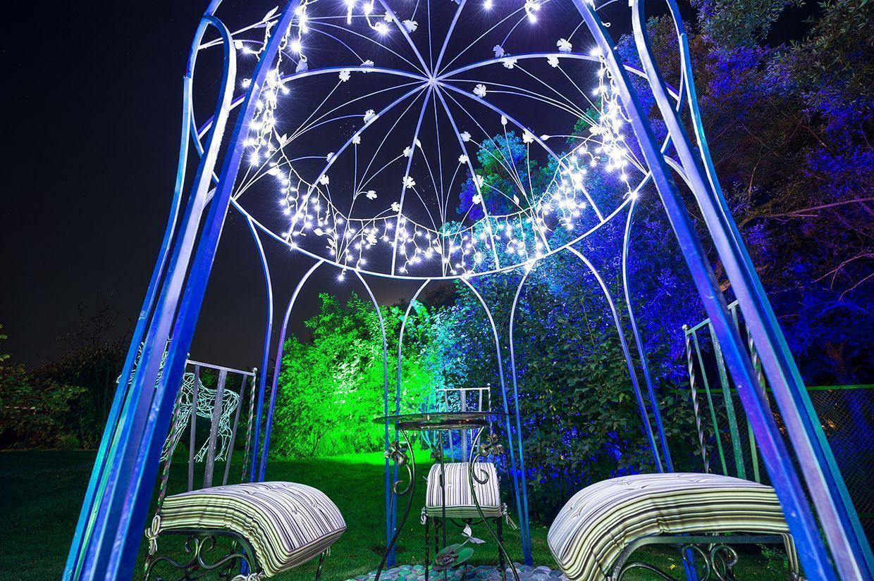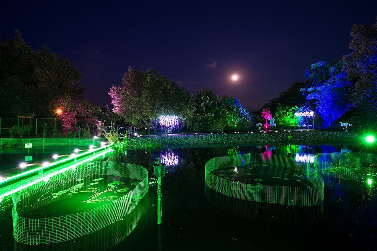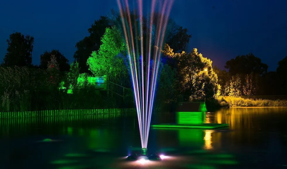 Для подсветки декоративного водоёма (пруда) применена многоцветная RGB светодиодная лента arlight®, защищённая от влаги со степенью защиты IP67. Лента закреплена с нижней стороны мостков. Управление осуществляется при помощи многозонного пульта ДУ arlight® - SR-2819T8 Black с сенсорным управлением в сочетании с RGB контроллерами arlight® - SR-1009EA.