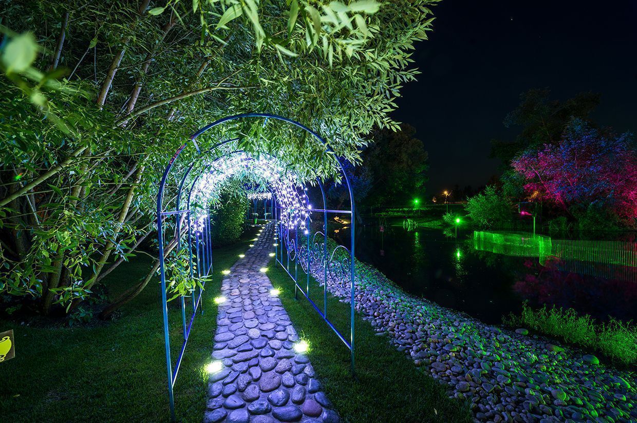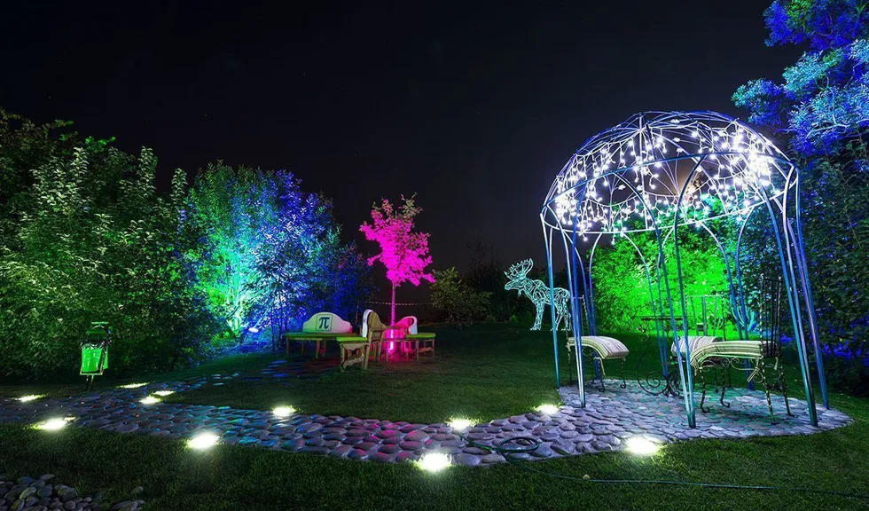 Светодиодная ландшафтная подсветка состоит из подсветки деревьев и освещения дорожек. Для подсветки деревьев используются герметичные светодиодные прожекторы, собранные на основе алюминиевого профиля для светодиодов и светодиодных лент arlight® - SL80 и мощных RGB светодиодов arlight® - ARPL-3W-EPA-RGB с линзами 30°.