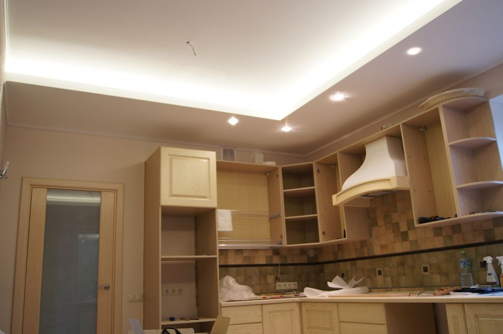 Подсветку рабочей поверхности устраивают под навесными шкафами. Существует несколько вариантов ее организации: