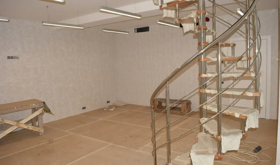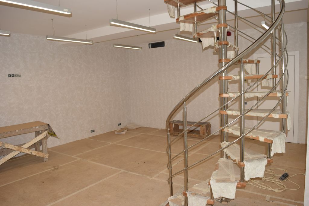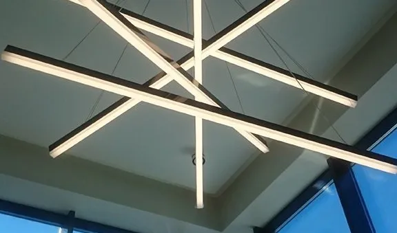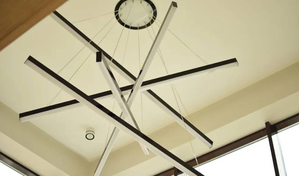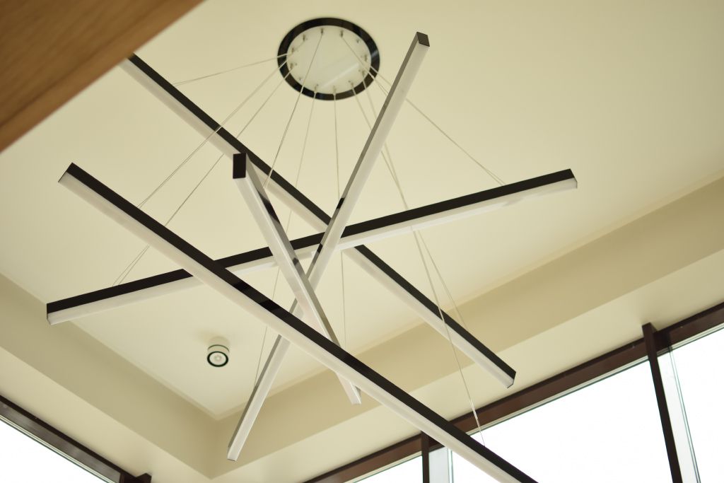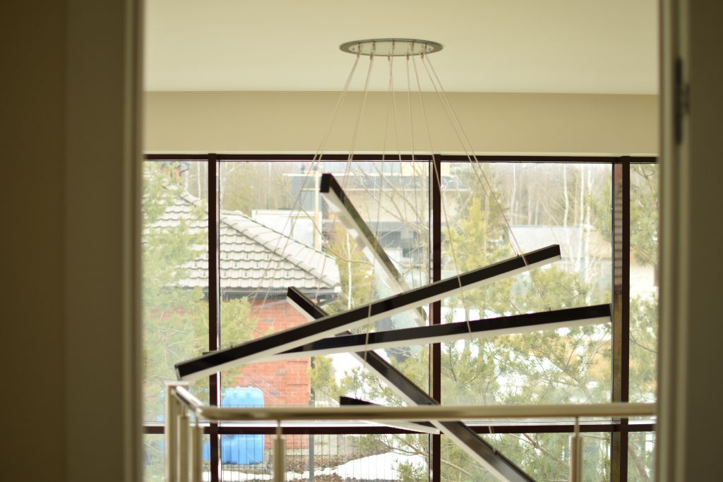 Высота потолка зала в области лестничного пролёта позволила установить объемный светильник, созданный из алюминиевых профилей и подвесов. Подвесы отрегулированы таким образом, что профили находятся на разных уровнях под наклоном. Конструкция получилась объемной, но в то же время лёгкой, что подчеркнуло общий стиль интерьера зала.