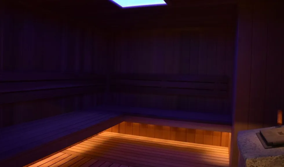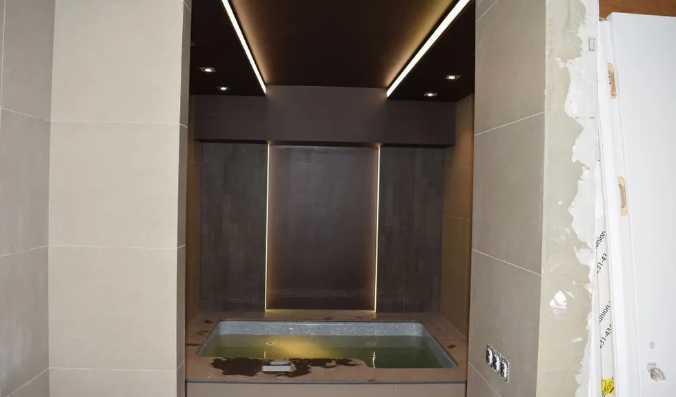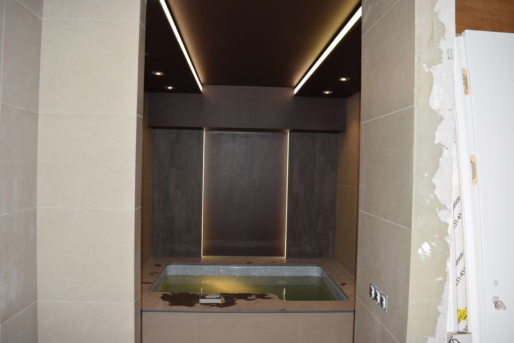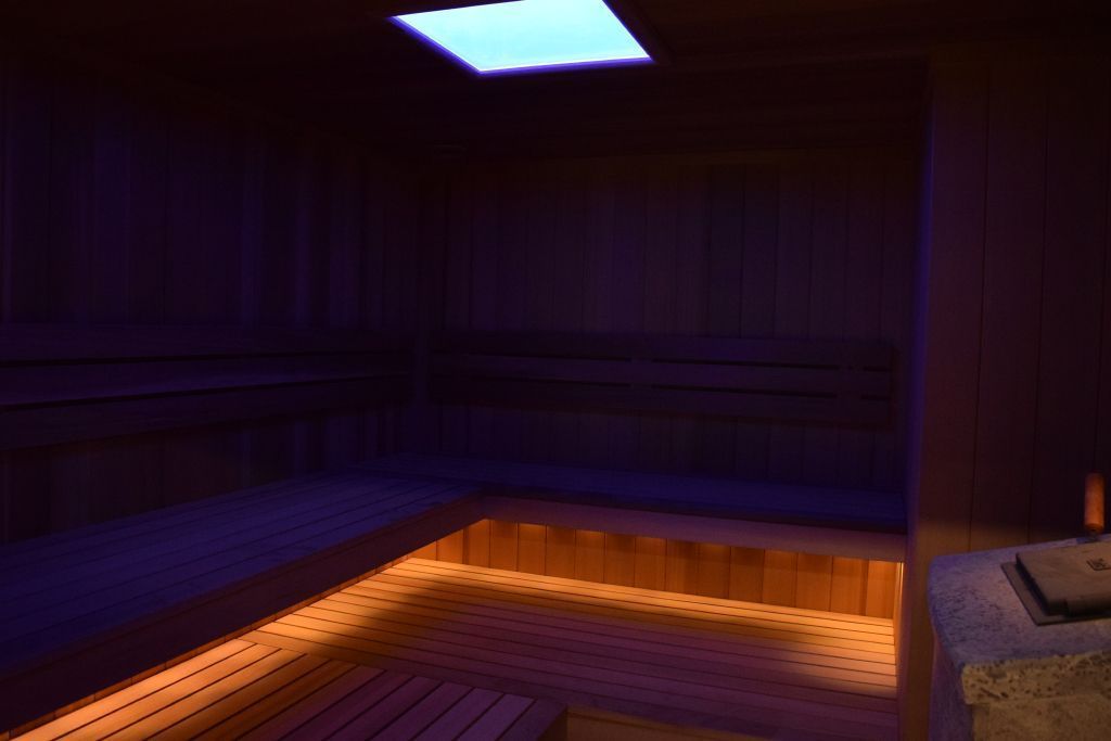 Отдельно отметим сауну. Она является зоной с высокой влажностью и температурой, поэтому к безопасности и надёжности применяемых в ней источников света предъявляются повышенные требования. Светильником в сауне служит светодиодная панель, обрамлённая деревянной рамкой. А подсветка была установлена под лавки верхнего уровня. Для этого была использована герметичная светодиодная лента arlight®t с тёплым белым свечением, соответствующим данному помещению. В предбаннике и зоне джакузи освещение выполнено на основе точечных встраиваемых светильников и "линий света". Эффект неразрывных световых линий достигается путём использования светодиодной ленты, установленной в алюминиевый профиль с матовым экраном. В душевой зоне смонтирован светящийся потолок, сделанный из матового светопропускающего оргстекла и скрытой за ним светодиодной ленты. Таким образом достигается эффект светящейся поверхности потолка.