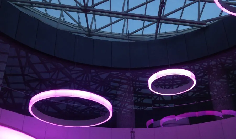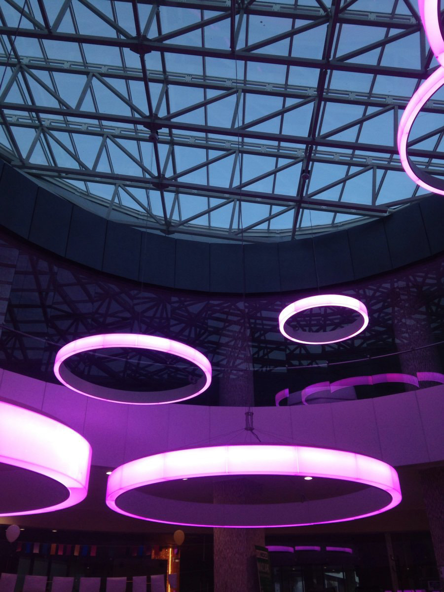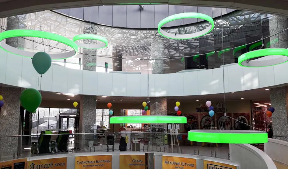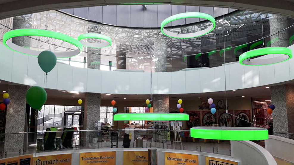 Освещение современного многофункционального концертного комплекса, расположенного на берегу Балтийского моря, впечатляет масштабом. Внутренние интерьеры продуманы так же креативно. В качестве основного и декоративного освещения выступают дизайнерские подвесные светильники, сделанные из алюминиевого профиля и RGB-ленты. Управлять цветом можно с помощью декодера и пульта управления для многоцветных лент.