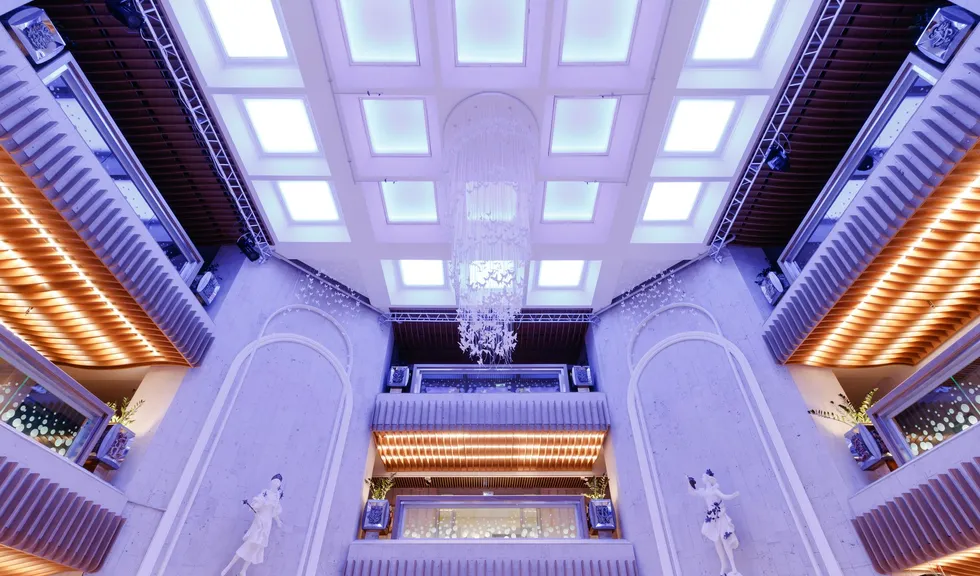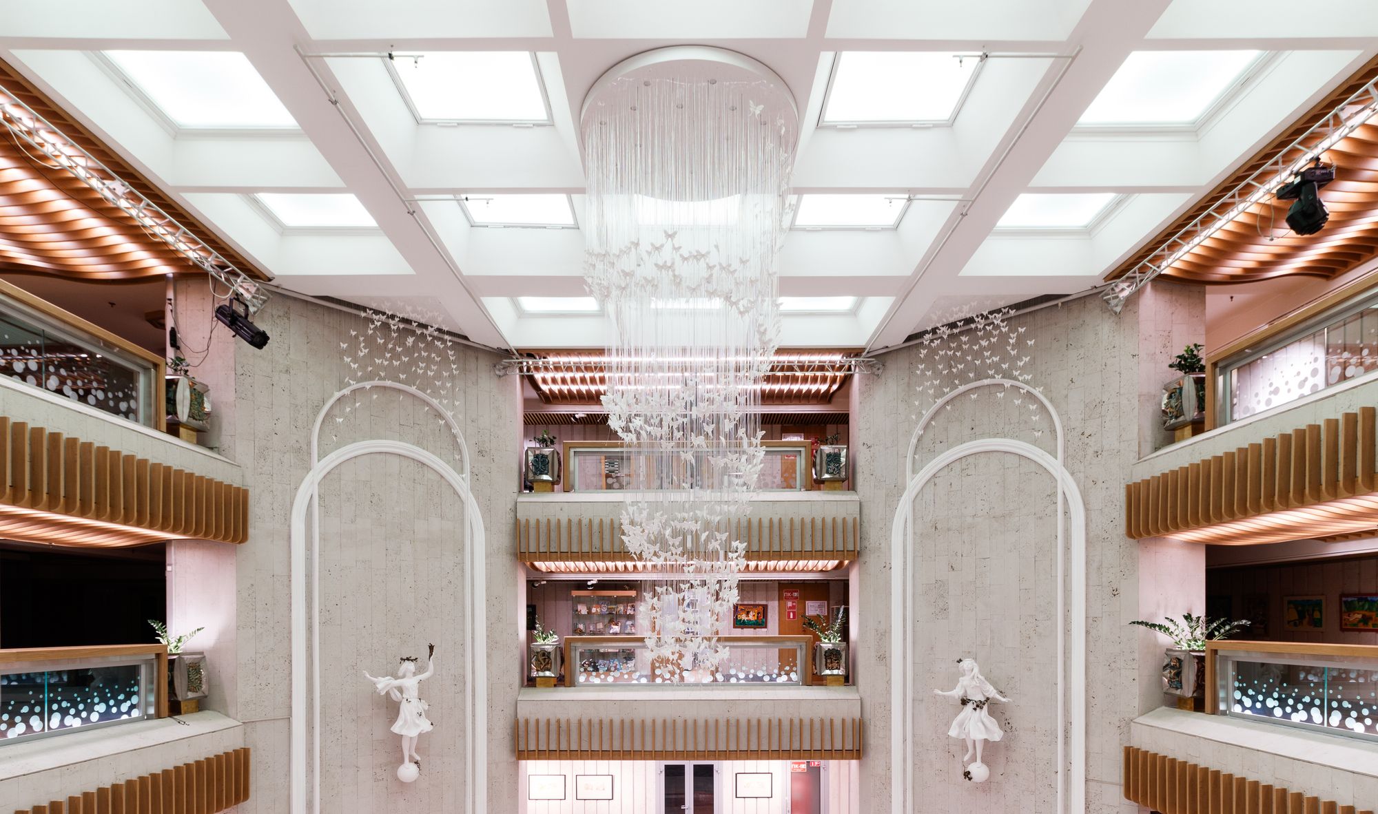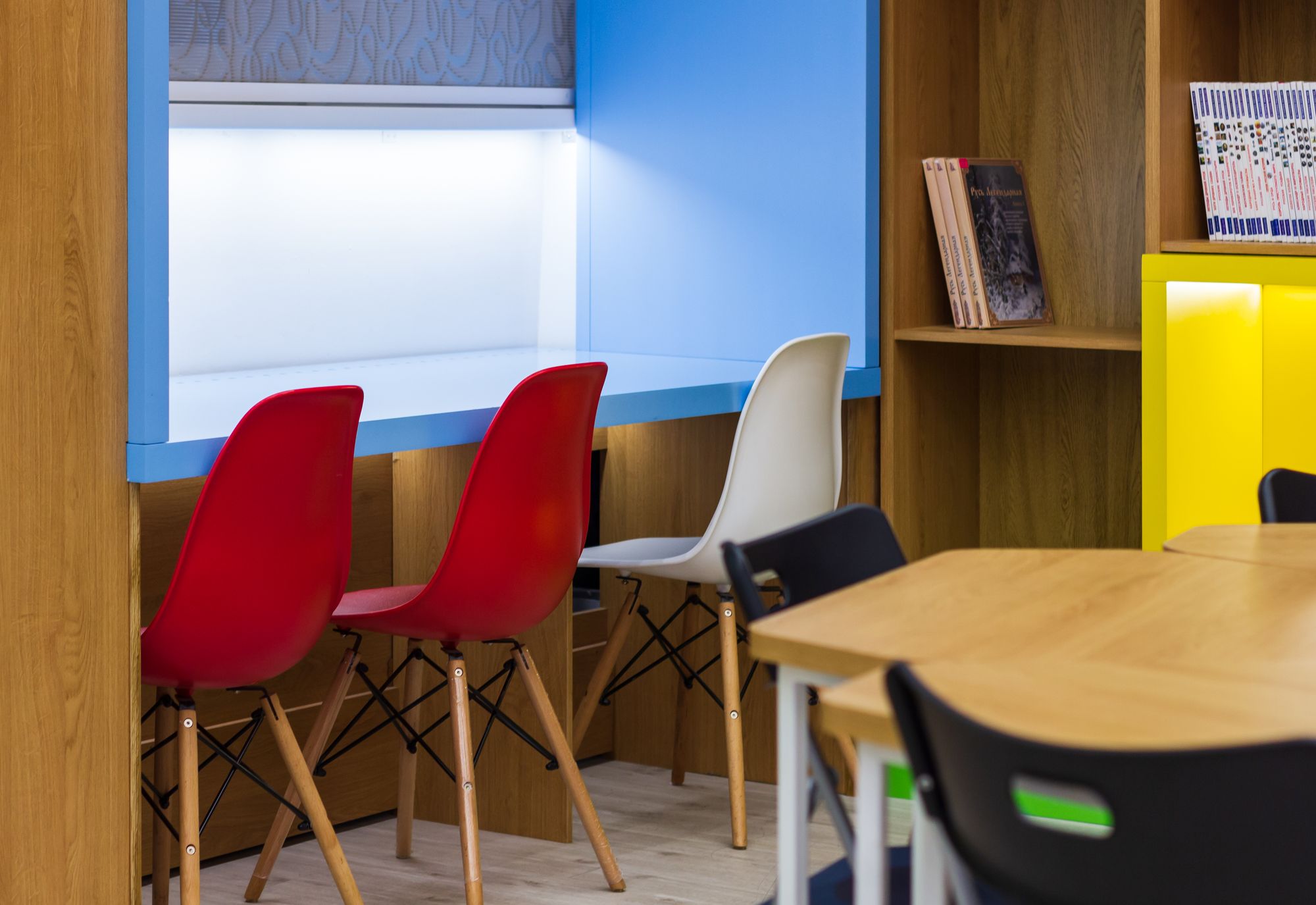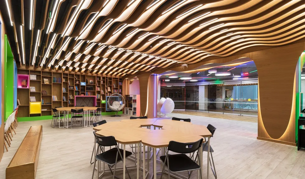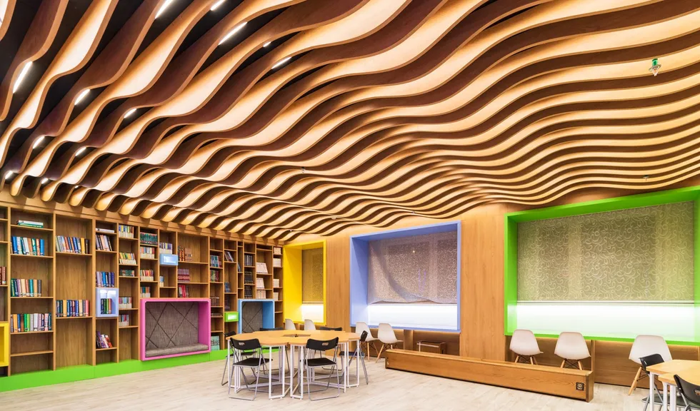 В этом красивом и масштабном проекте использовано максимальное количество светодиодной ленты различных цветов свечения. Библиотека похожа на сказочное царство света, где герои книг способны оживать в воображении читателей. При всей яркости и красочности проекта основным цветом свечения является классический белый с высоким индексом цветопередачи, который не вызывает переутомления глаз во время чтения книг. Для смены цвета свечения лент используются сенсорные пульты управления. Под потолком разместились большие квадратные светильники, напоминающие мансардные окна. Во многих залах библиотеки сделан реечный потолок с эффектом волн и встроенными световыми линиями. Интересное сочетание одноцветных и многоцветных лент, прямых световых линий и круглых потолочных светильников создает в помещении удивительную атмосферу.