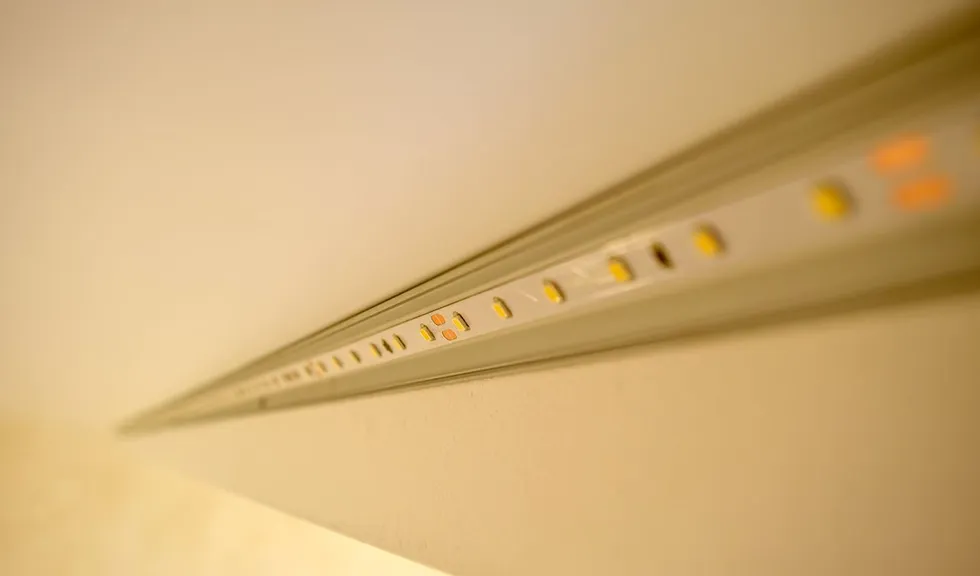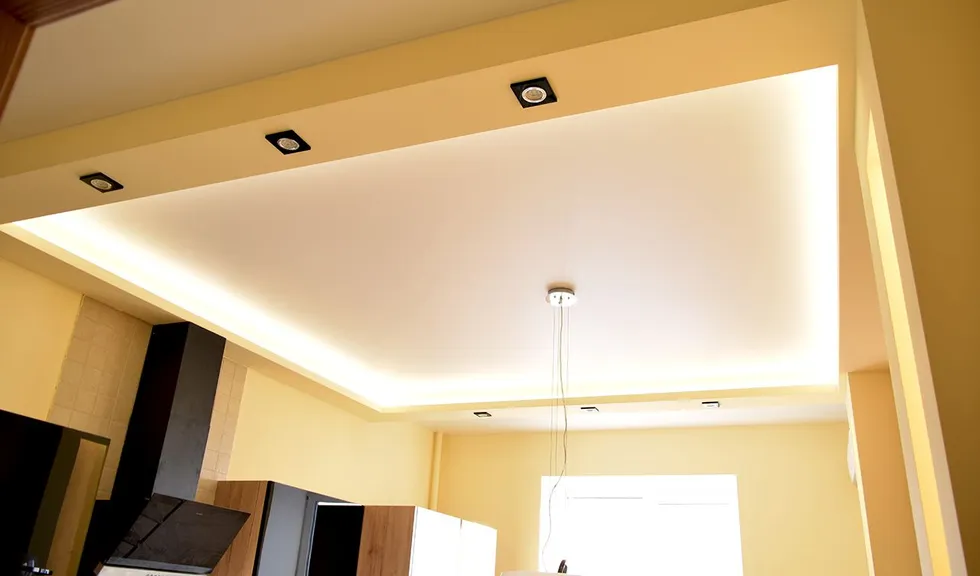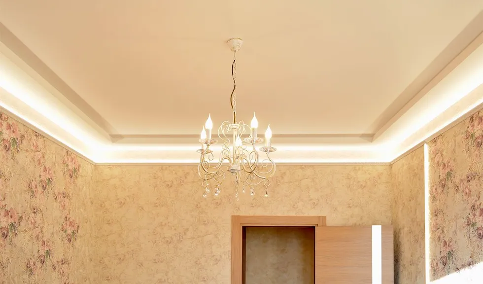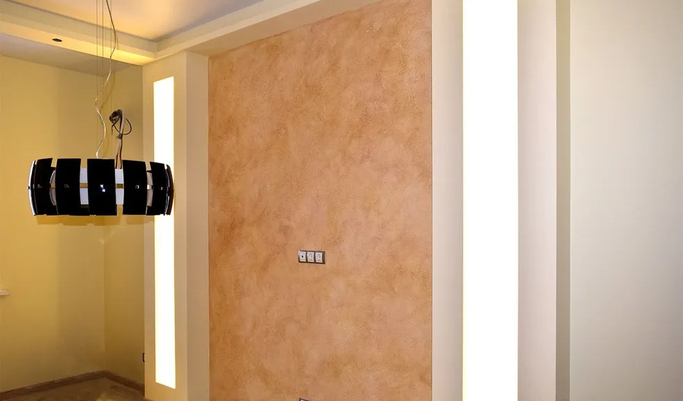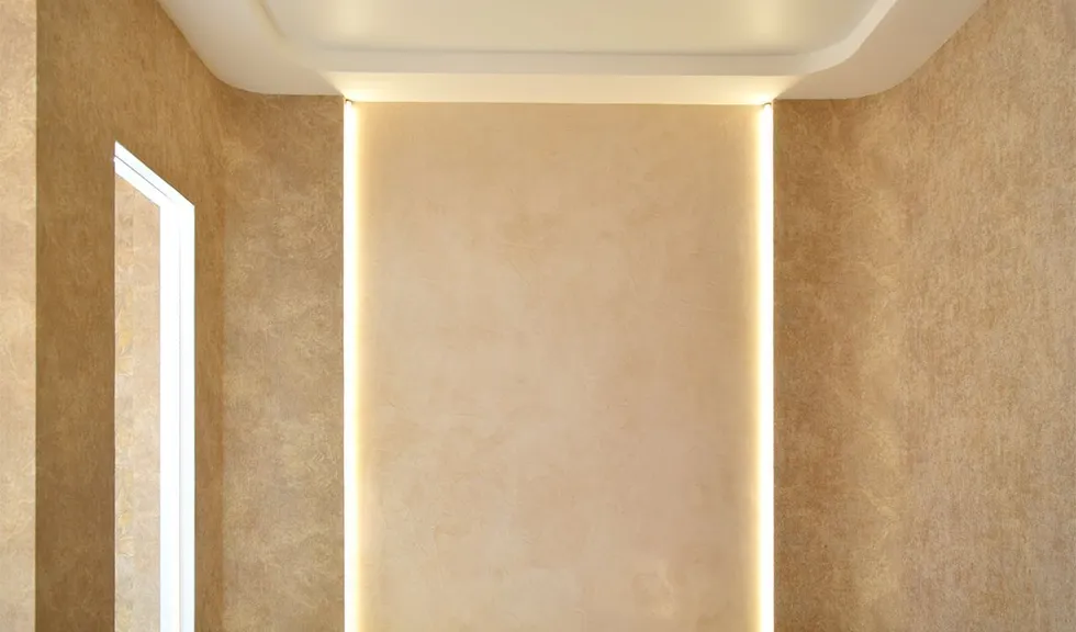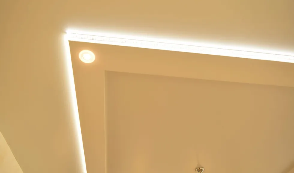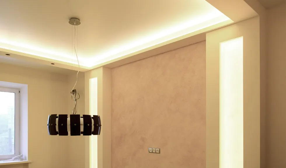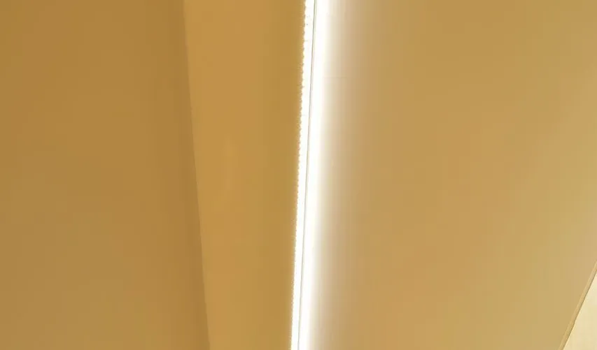 Дополнительное светодиодное освещение в многоуровневом потолке из гипсокартона. Зонирование помещения вертикальными линиями света.
