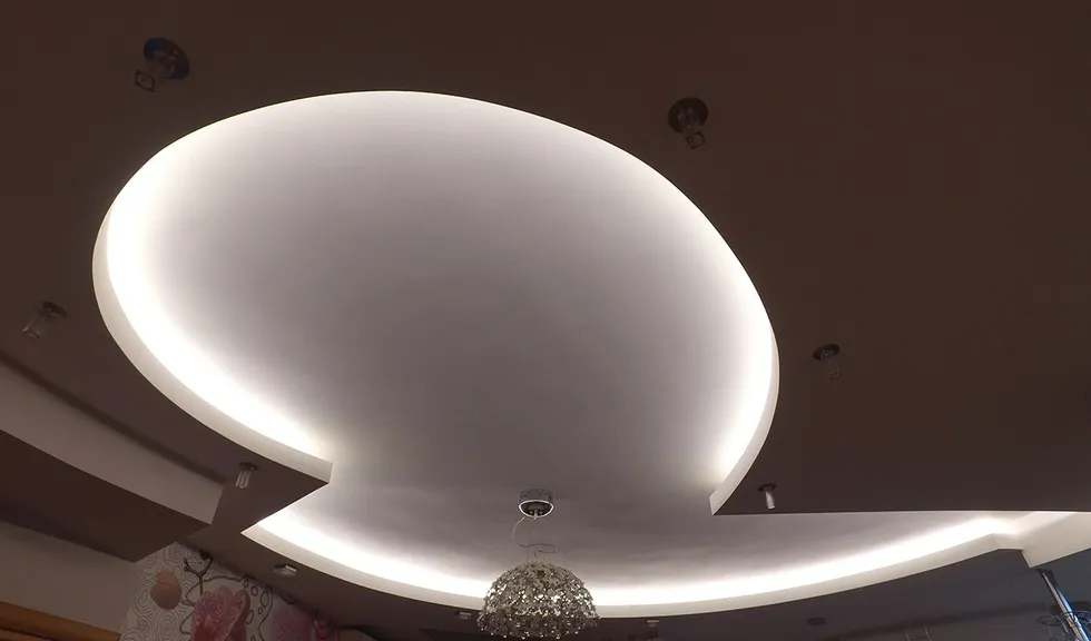 Из ниш были демонтированы люминесцентные лампы. Питающие их кабели были заменены на новые, ниши были очищены и подготовлены для установки светодиодных лент. Т.к. данная подсветка используется и в качестве основного освещения, то была выбрана мощная светодиодная лента smd 3528 240 светодиодов на метр, которую разместили по периметру потолка.