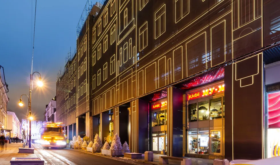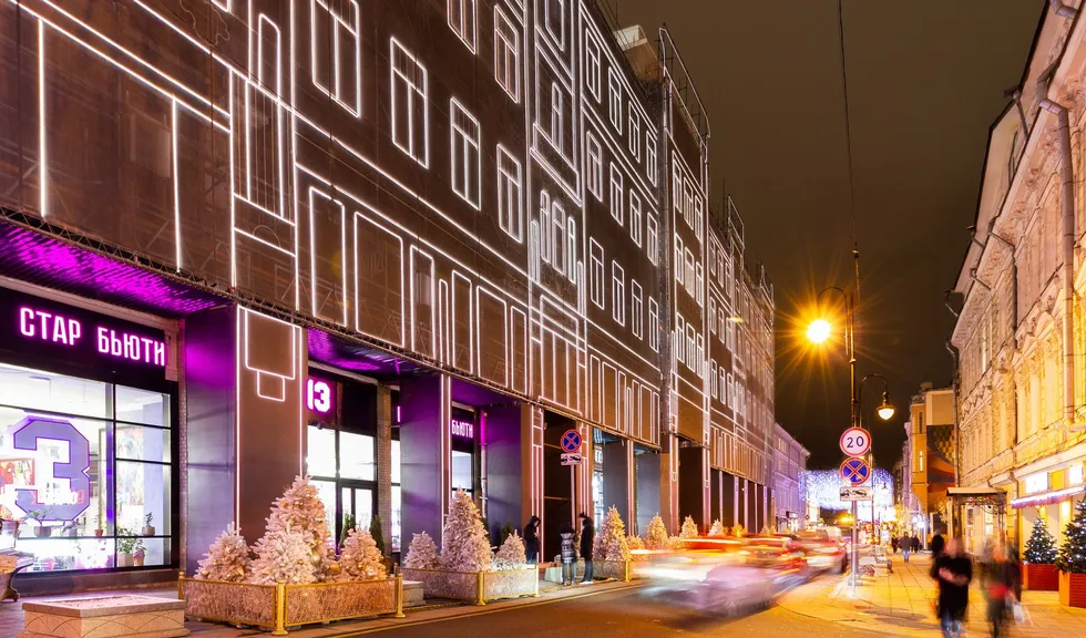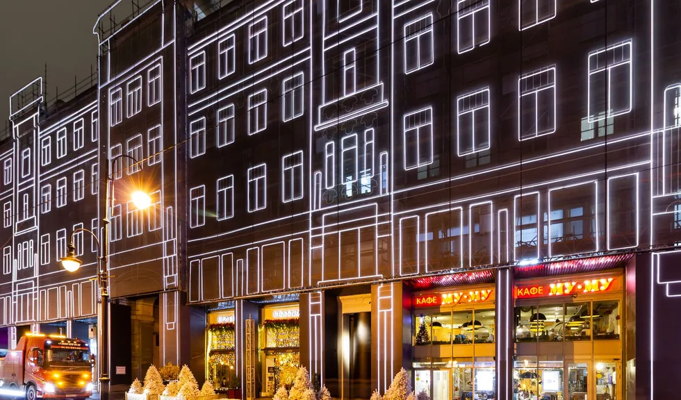 При создании эффектной фасадной подсветки премиального жилого комплекса «Большая Дмитровка IX» было использовано интересное техническое решение. Гибкий неон закреплен на внешней стороне строительной сетки, что позволило проводить отделочные работы и в то же время сделать законченную декоративную подсветку. Возможность изменения цвета RGB-неона с помощью контроллера дает возможность менять световой облик здания. За счет высокой степени пылевлагозащиты IP65 гибкий неон можно эксплуатировать при любых погодных условиях."
